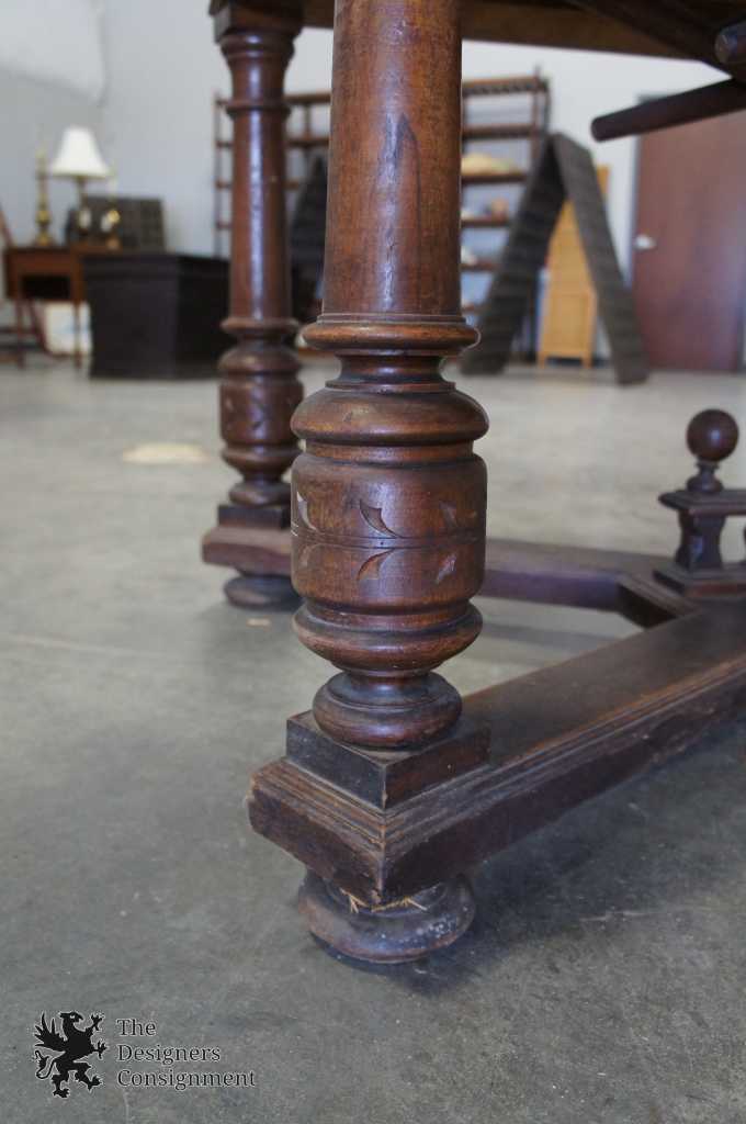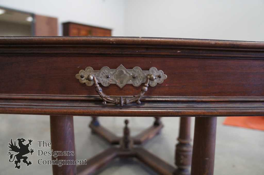 Features ornate details, trestle base and extendable drawers