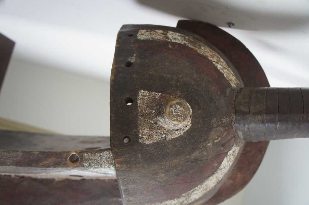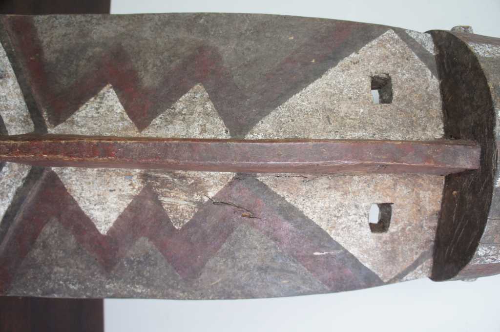 Monumental tribal hardwood horned bobo mask. The perfect sculptural wall object for any setting. Meticulously crafted with a pierced Galea style helmet and leather wrapped horns. Painted in a red white and gray.