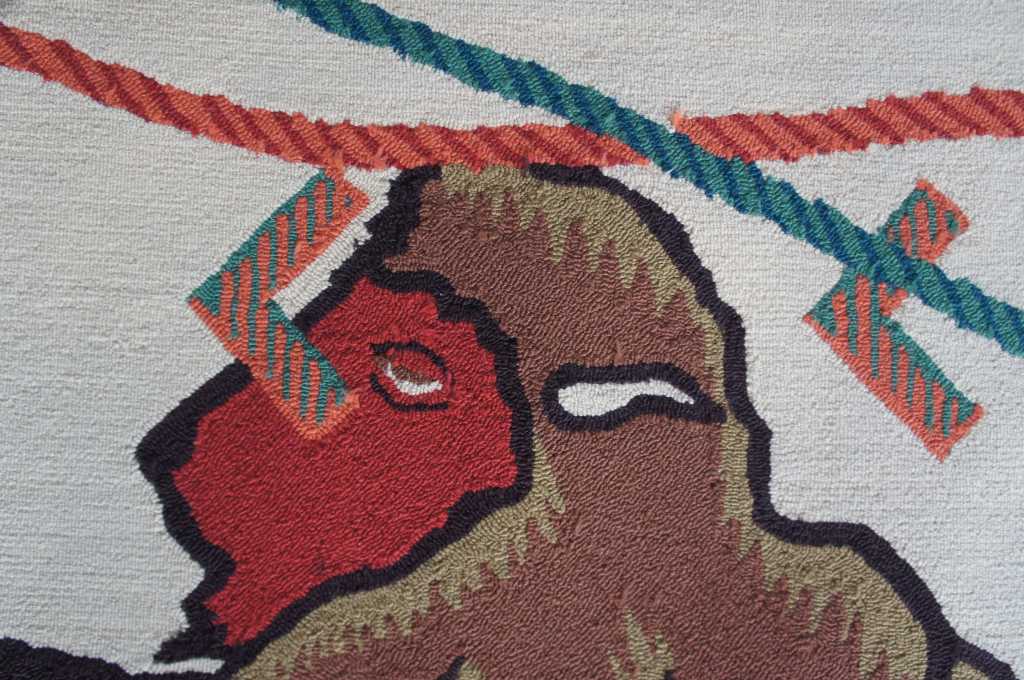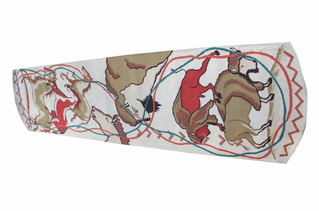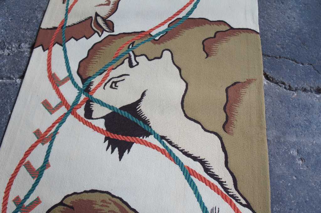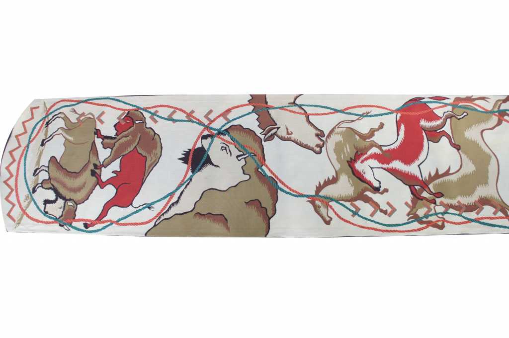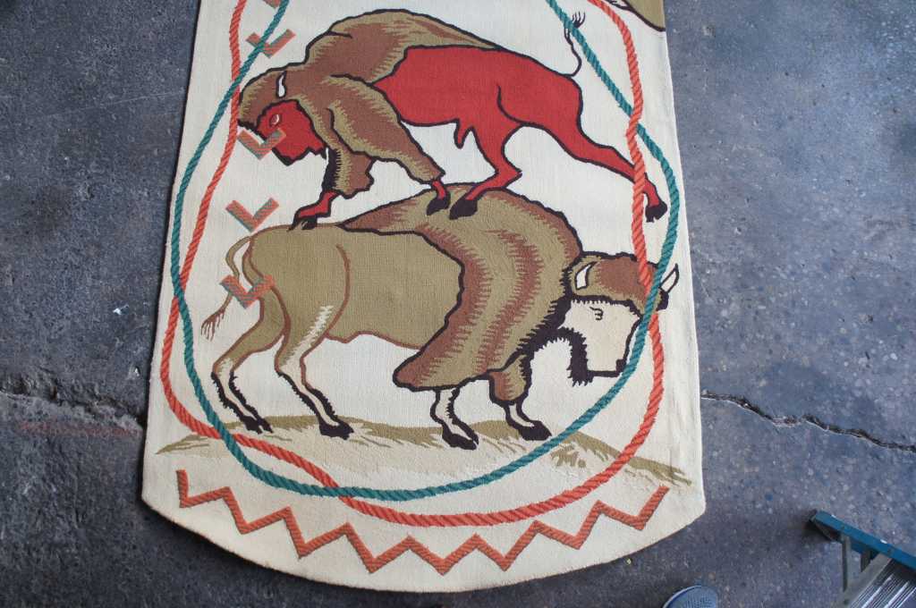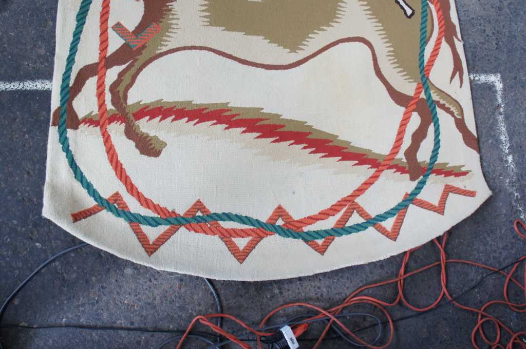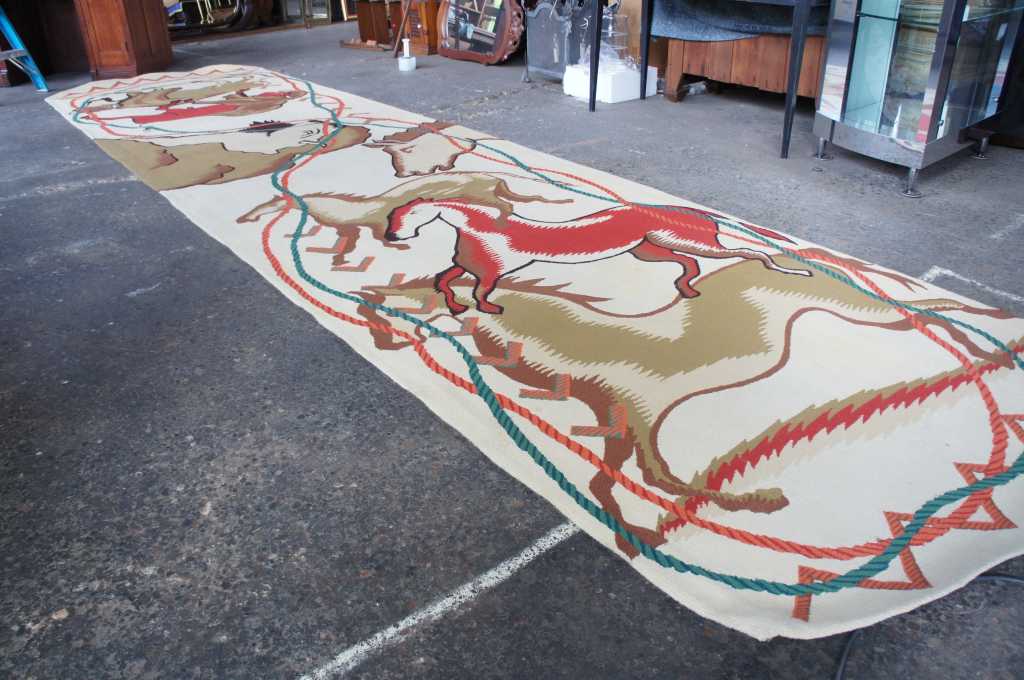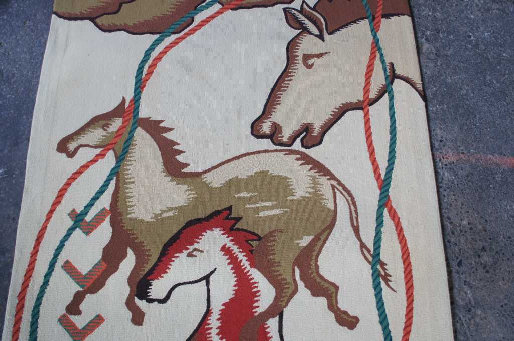 Innovative Carpets Hand Tufted Carpet, 100% New Zealand Wool, Diamond Point 9 Colors, SC#99. A beautiful southwestern animal print themed runner. Features horse and bison with a rope design wrapped in a figure eight pattern around the outside. Beige with reds, greens and browns. The perfect covering for a long hallway or entry