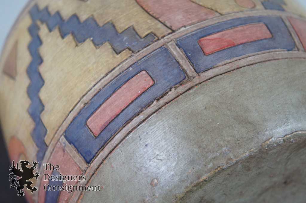 Beautifully designed indigenous southwestern pottery vase. Beige with alternating purples and reds.