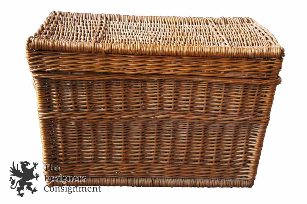 Wicker basket with hinging lid. Perfect for laundry or use on picnics.