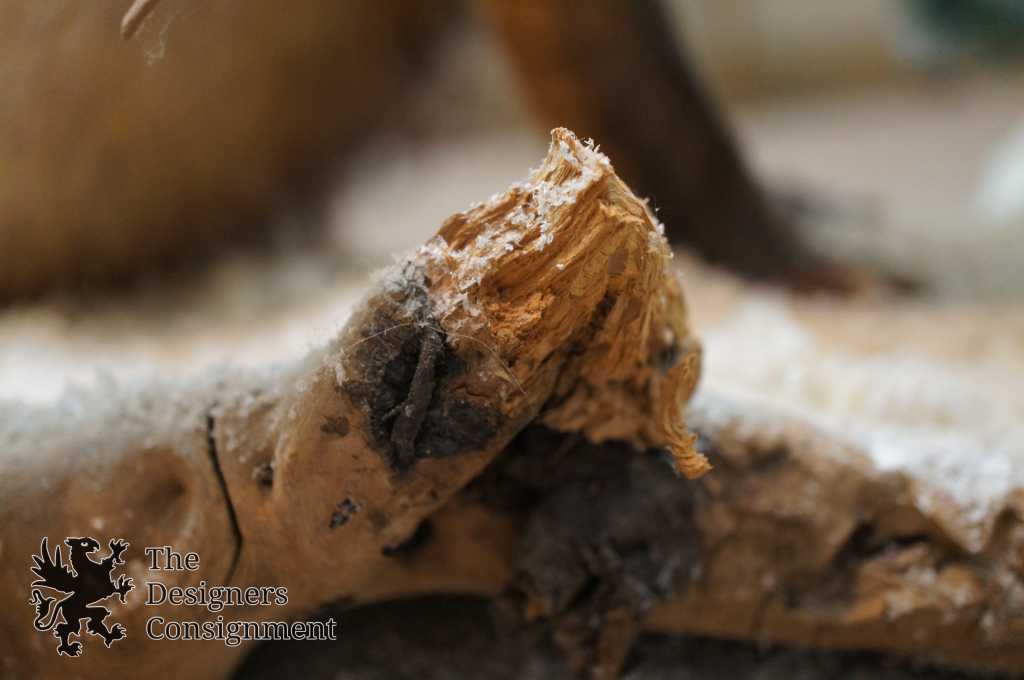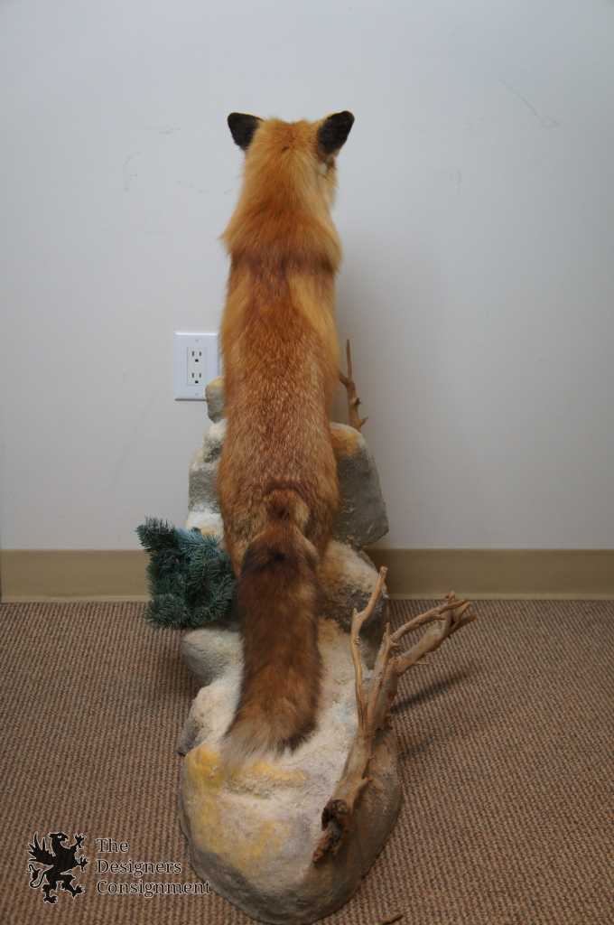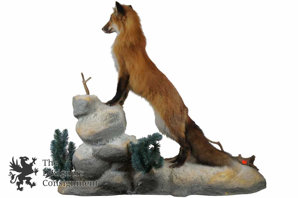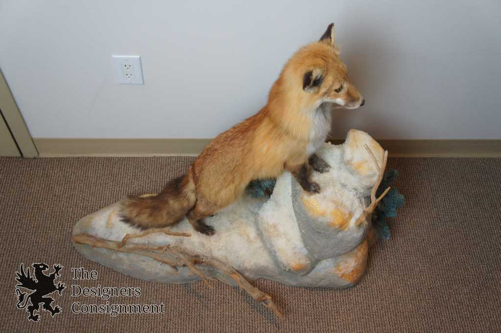 1997 Red Fox Taxidermy Mount. Beautifully displayed standing upon a bed of snowy rocks with accents of sticks and trees. Perfect for display on top of any surface. The landscape of the mount is Styrofoam with hand painted accents and garnishes of pine needles and twigs. Along the bottom the Michigan Taxidermist Specimen ID can be seen.