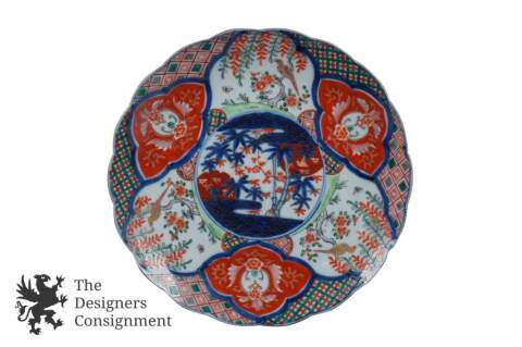 Late 19th century Imari porcelain plate. Hand painted in reds, blues and greens with birds and bamboo at the center