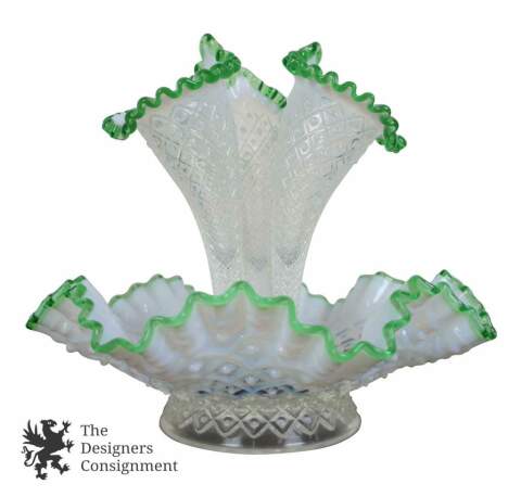 Vintage epergne made by the Fenton Glass Co. The pattern is Diamond Lace with Emerald Crest. The body is white milk glass with a diamond hobnail design. The edges are ruffled with a green crest. There are 3 openings in the bottom of the bowl for the horns to fit into.