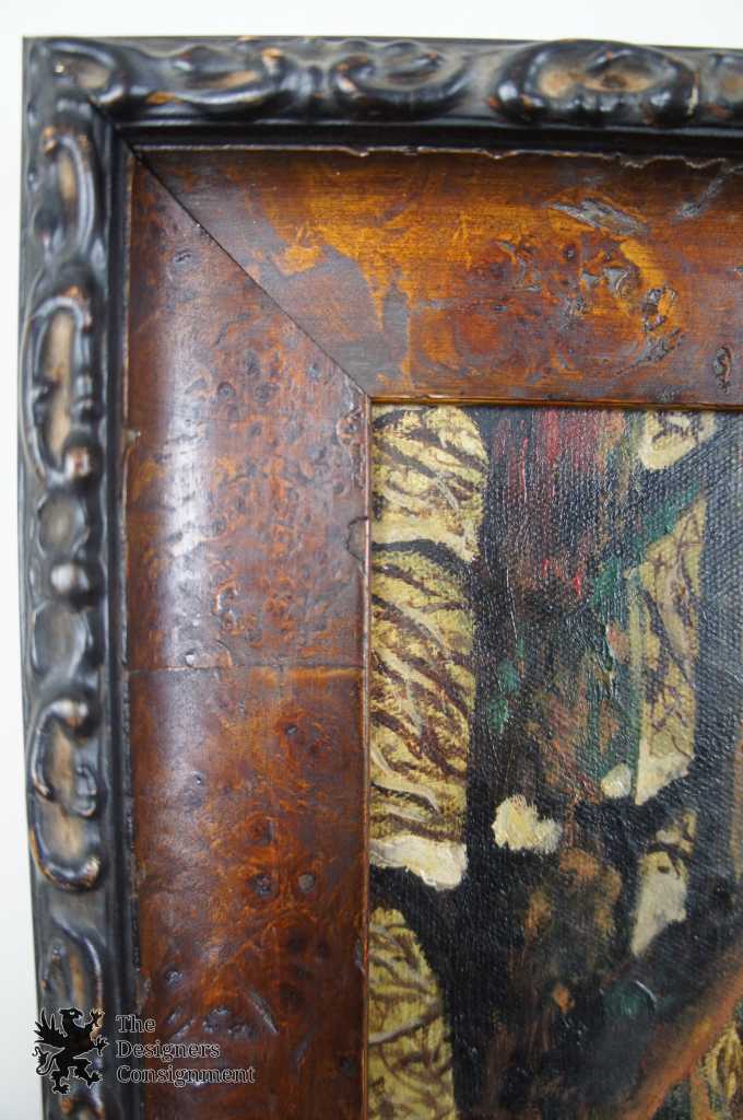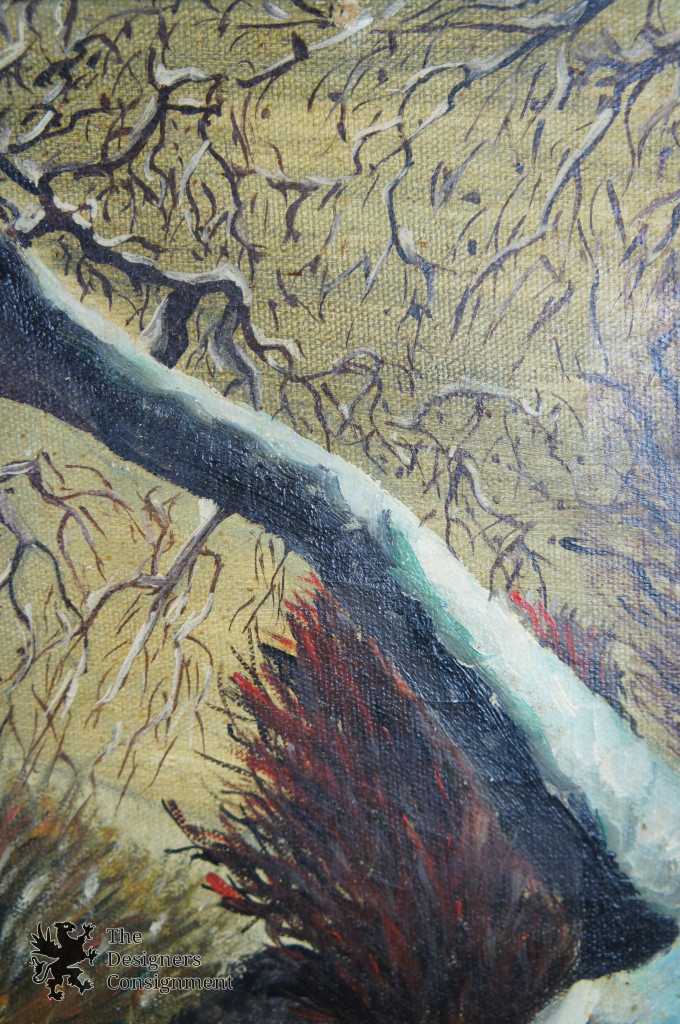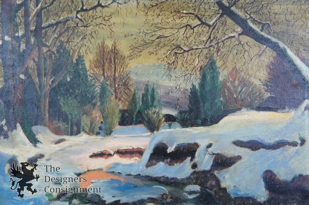 Mid Century Oil Painting. Signed R.E. Parker, 1947. Features a snowy woodland landscape. Beautifully framed with burled edge.