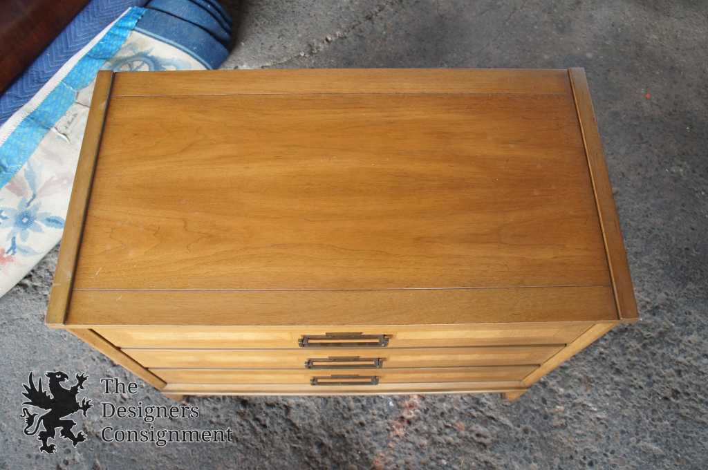 Circa 1960s Chest by White Fine Furniture. An asian inspired piece with classic mid century flare. Made from walnut with a 2 tone front over an elevated base. Features 3 dovetailed drawers with compartments in the uppermost drawer. A neat addition to any space.