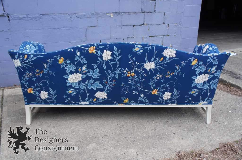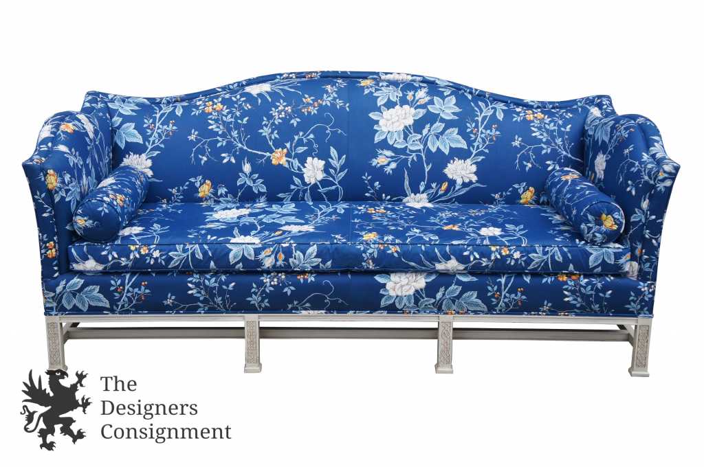 C. 1960s Erwin-Lambeth camelback sofas. A beautiful blue floral upholstery with bolster pillows over a white base with fretwork along the legs. Deep seating with down blend cushions. The perfect compliment to any setting.