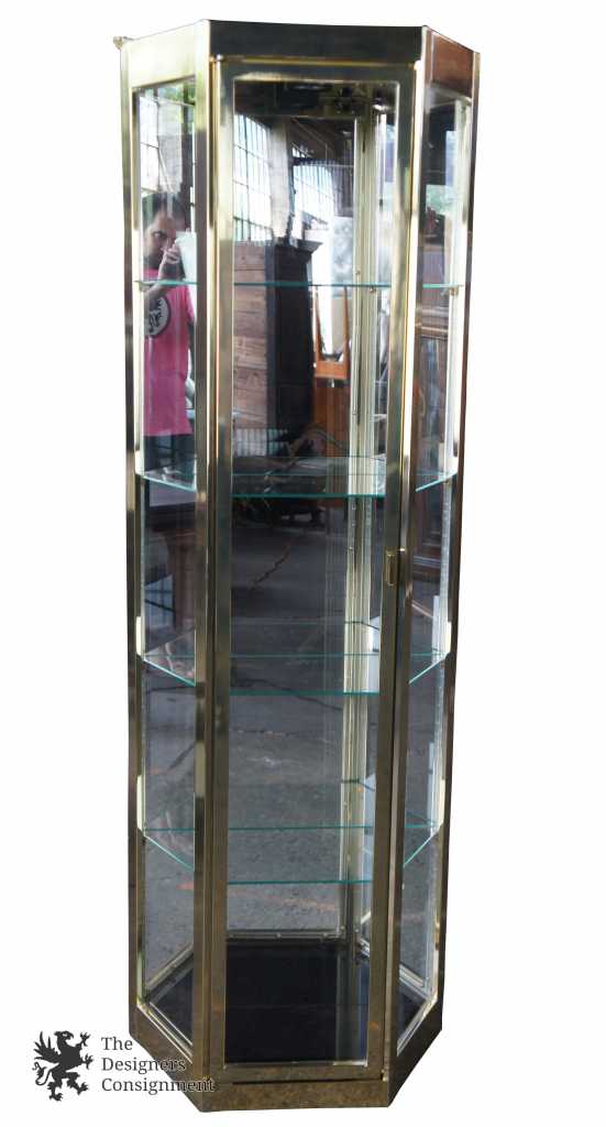Traditional/Modern brass display console by Philip Reinisch Co. Illuminated with mirrored backing 4 glass shelves and brass handle.