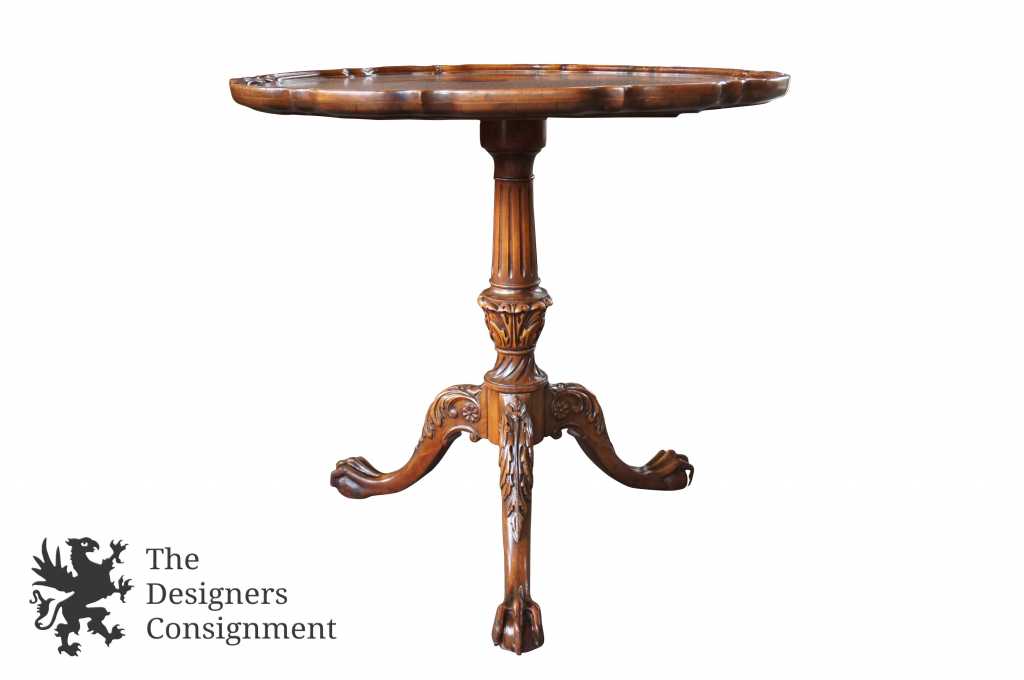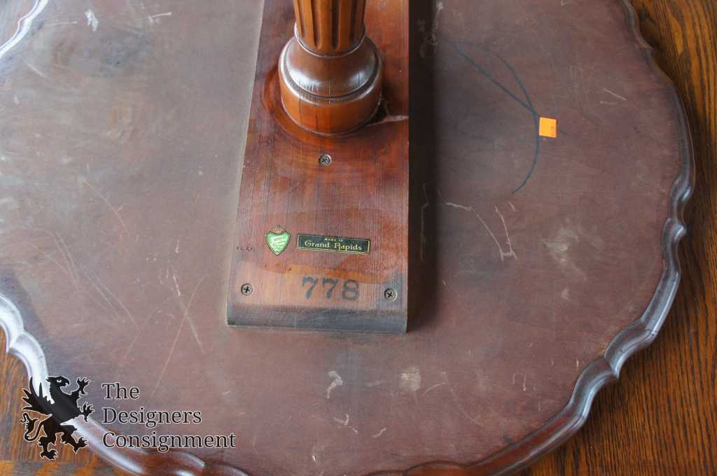 This exceptional table by Imperial was made in the 1940s. At the time the company was also building airplane wings for the government. The pie crust tea table has beautiful trimming and a lovely wood grain. Made from Mahogany with a fluted center post leading to acanthus carved flourishes along the legs and ball and claw feet. The perfect compliment to any setting.