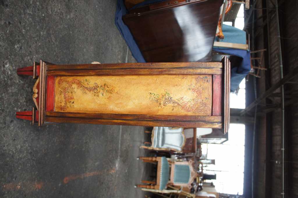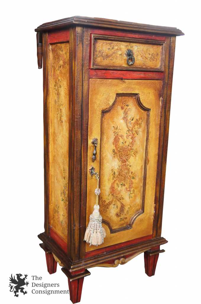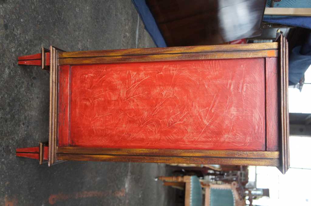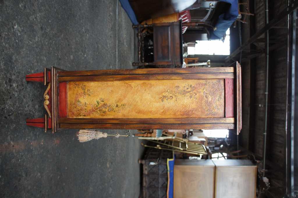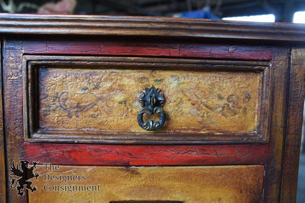 Red & Yellow Distressed Hall Cabinet. Floral painted with distressed finish. Features upper drawer and lower cabinet with 2 shelves.
