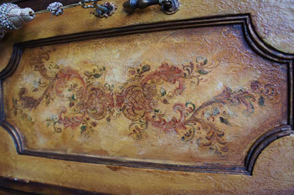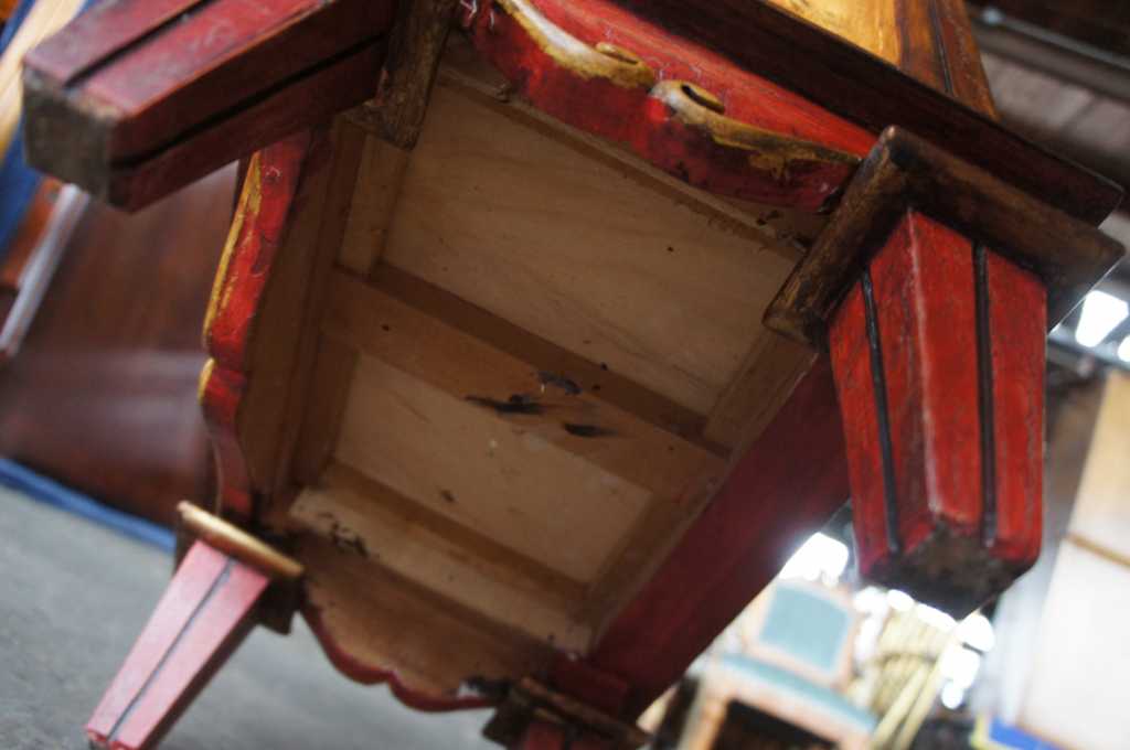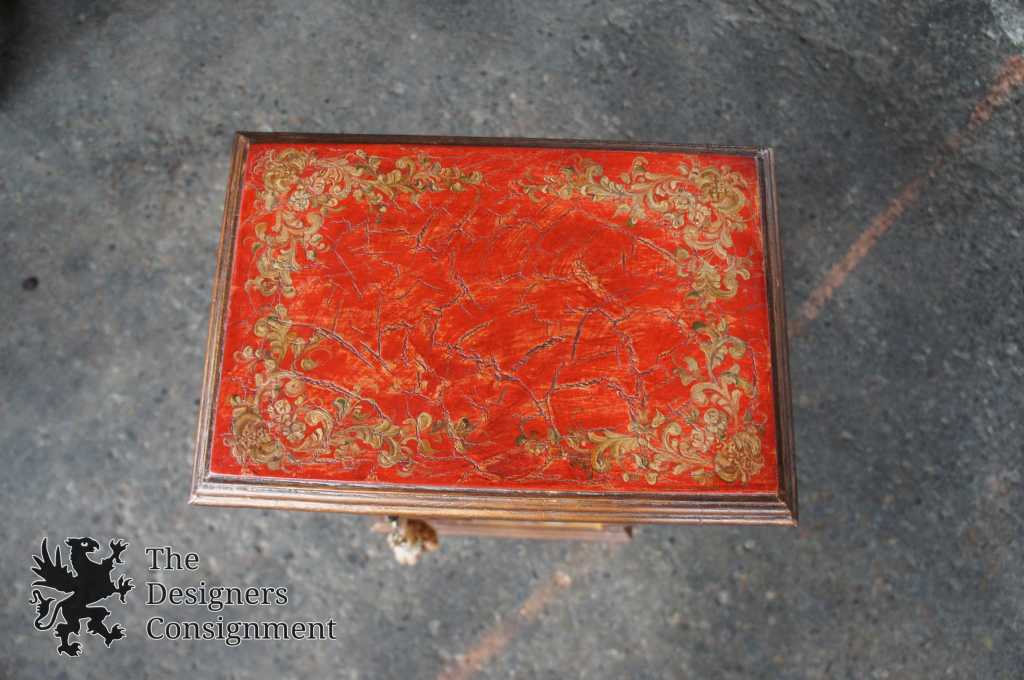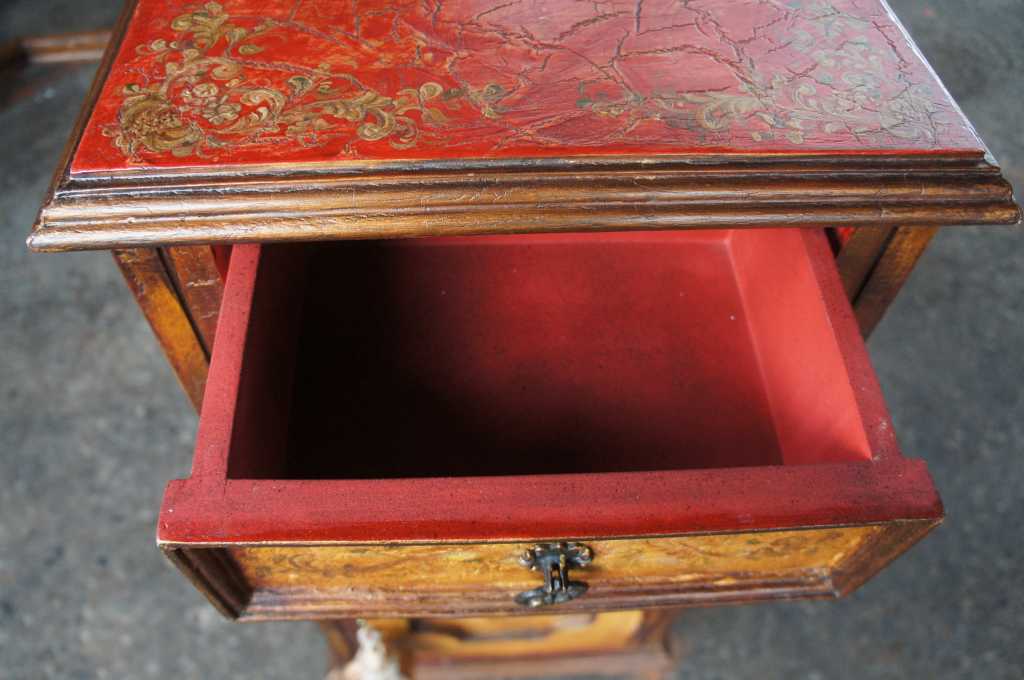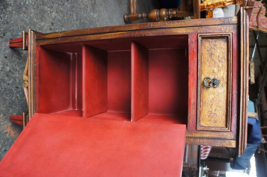 Red & Yellow Distressed Hall Cabinet. Floral painted with distressed finish. Features upper drawer and lower cabinet with 2 shelves.