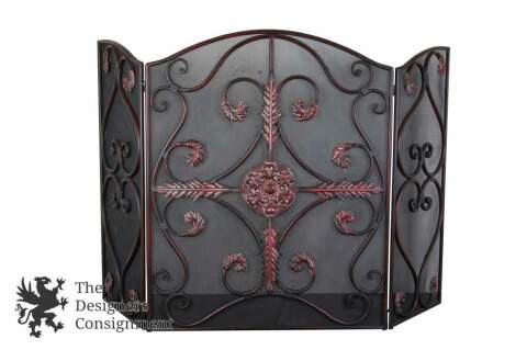 French Inspired Fireplace Screen. Made from wrought iron with floral and acanthus trimmed accents. Screens are lined in mesh.