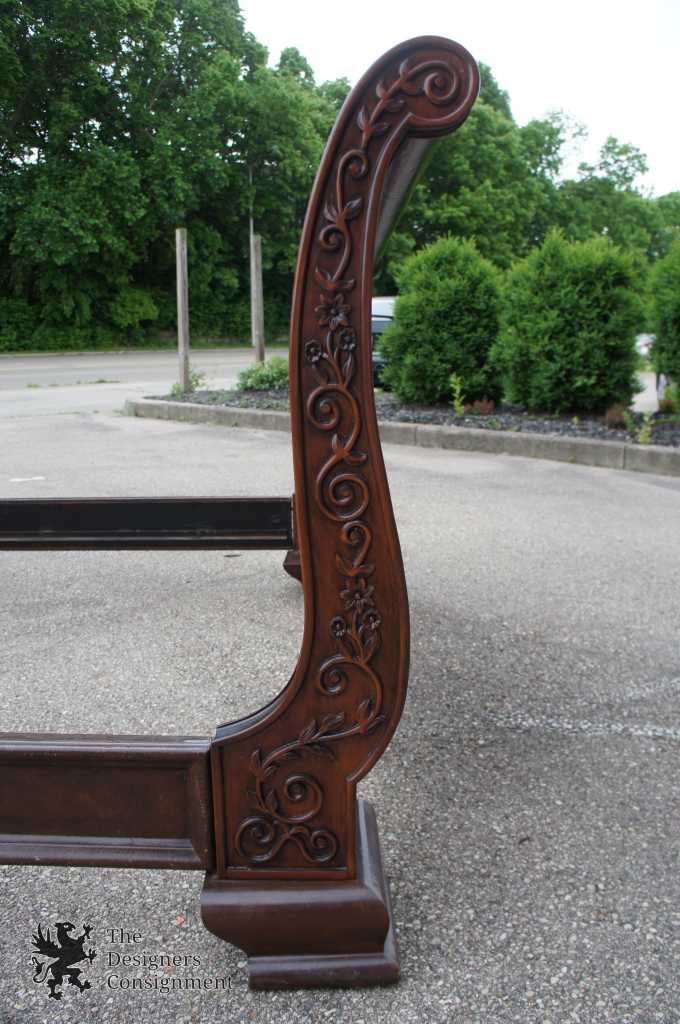 1993 Vintage Tooled Leather Sleigh Bed. Made from Mahogany with scrolling vine carvings along the sides of the head and footboard. Includes leather feet and side rails. Made in the Philippines.