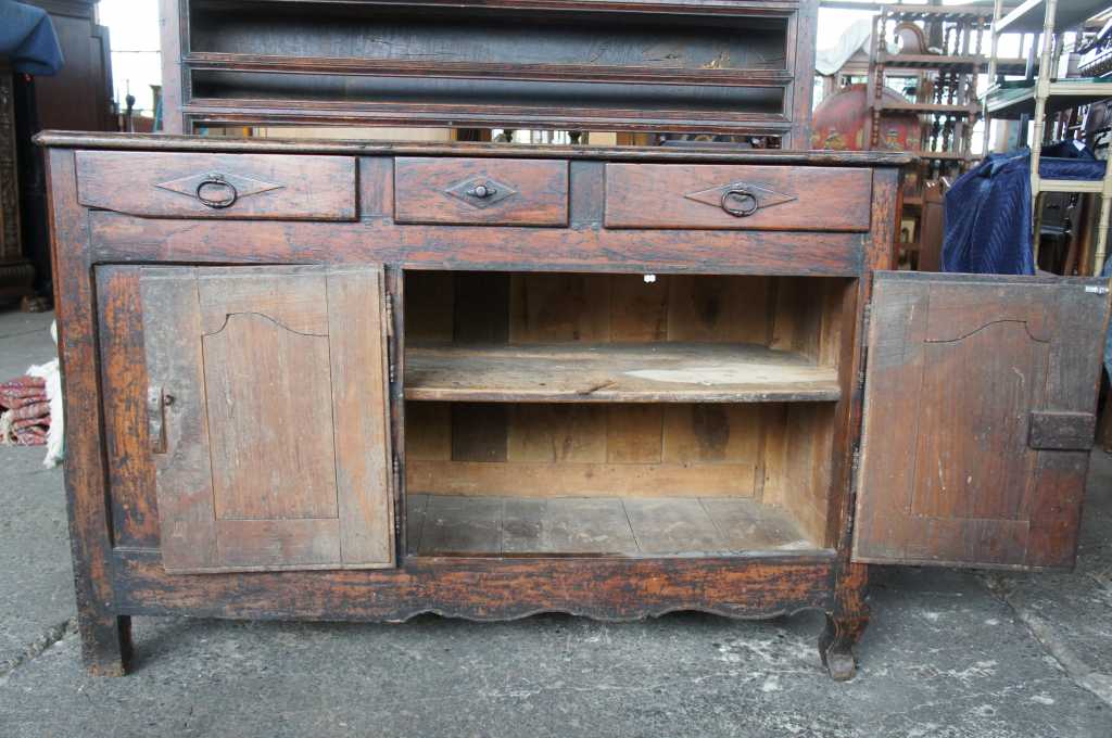 An 18th century rustic hutch. Beautifully distressed with 3 drawers over lower cabinet with shelf. Top is hooded with serpentine scalloped apron flanked by drop finials. Includes space for four shelves. A very stout piece that was made to stand the test of time. Drawers are dovetailed and include forged iron hardware.