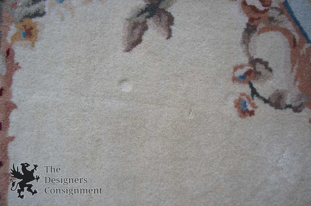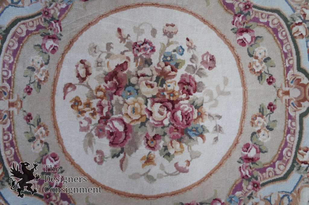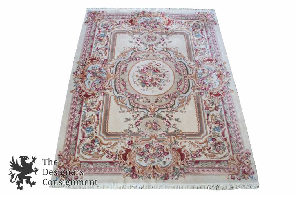 Aubusson is a town in Creuse River France. Aubusson rugs made in tapestry technique are among the most elegant and luxurious floor coverings. This beautiful 8' x 10' handmade area rug is in baroque styling with beautiful flowers and vibrant coloring. Made from Wool. Approximately 200 knots per square inch.