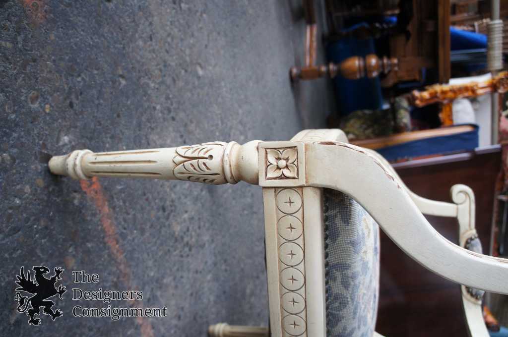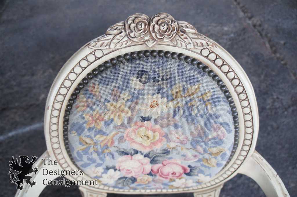 Turn of the century Louis XVI style provincial balloon back chair with acanthus carved flourishes. Features a colorful needlepoint upholstery. The perfect compliment to any room. This chair come to us from the Estate of Virginia Kettering whom with her husband took over the home of Charles Kettering when he passed. Charles built the home on Ridgeleigh terrace in 1914. The first home in the United States to have electric air conditioning. When Eugene passed, Virginia remained in the home redecorating and restoring it back to glory. When Virginia passed in 2003 the furniture was put into storage by her children.