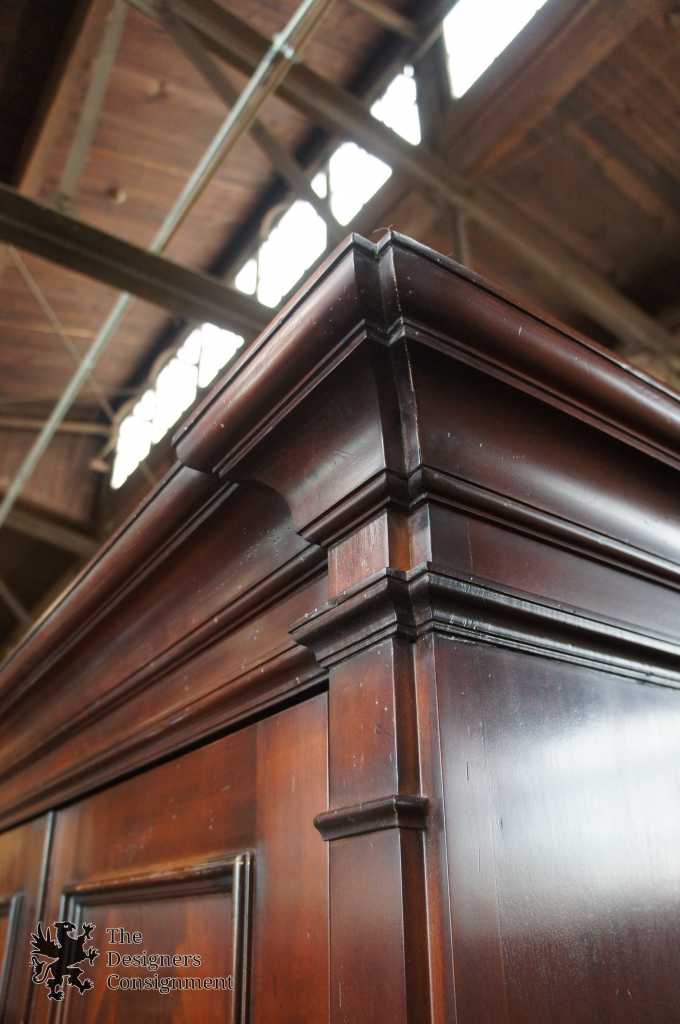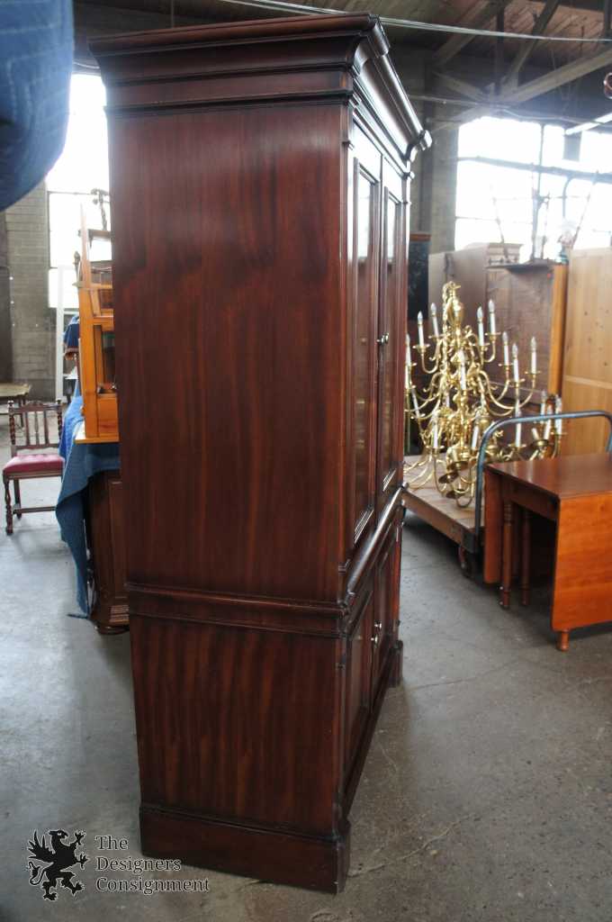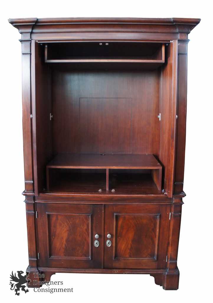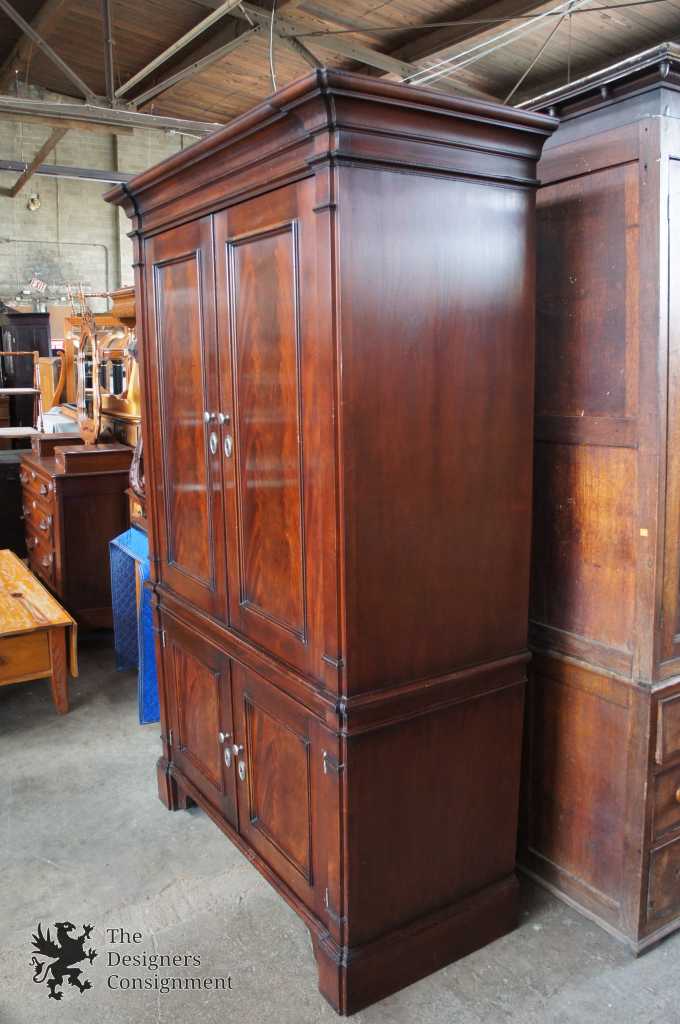 Baker Milling Road Media Cabinet. George III inspired with crotch mahogany front doors giving a stately appearance. The interior offers plenty of room for storage. Doors recess for a relaxed view. Lower portion has two dove-tailed drawers in addition to shelves. Naturally distressed.