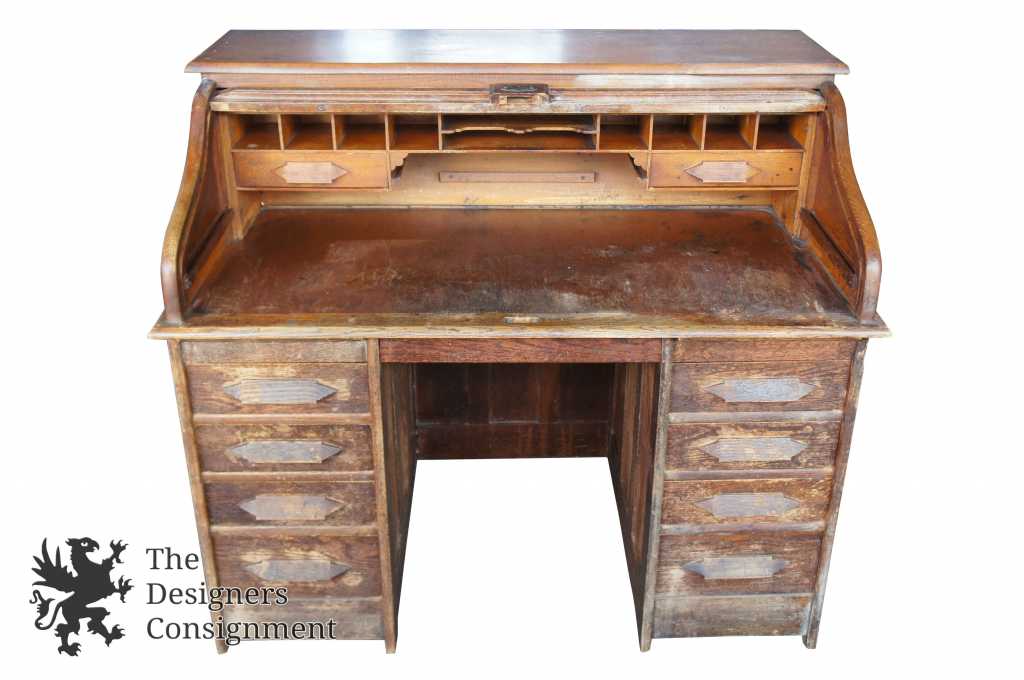 Late 19th Century Victorian Desk. A beautifully designed S curve roll top with tambour door. Opens to several pigeon holes and drawers. Lower portion has four drawers pull out slopes along each side. A great fit for any office.
