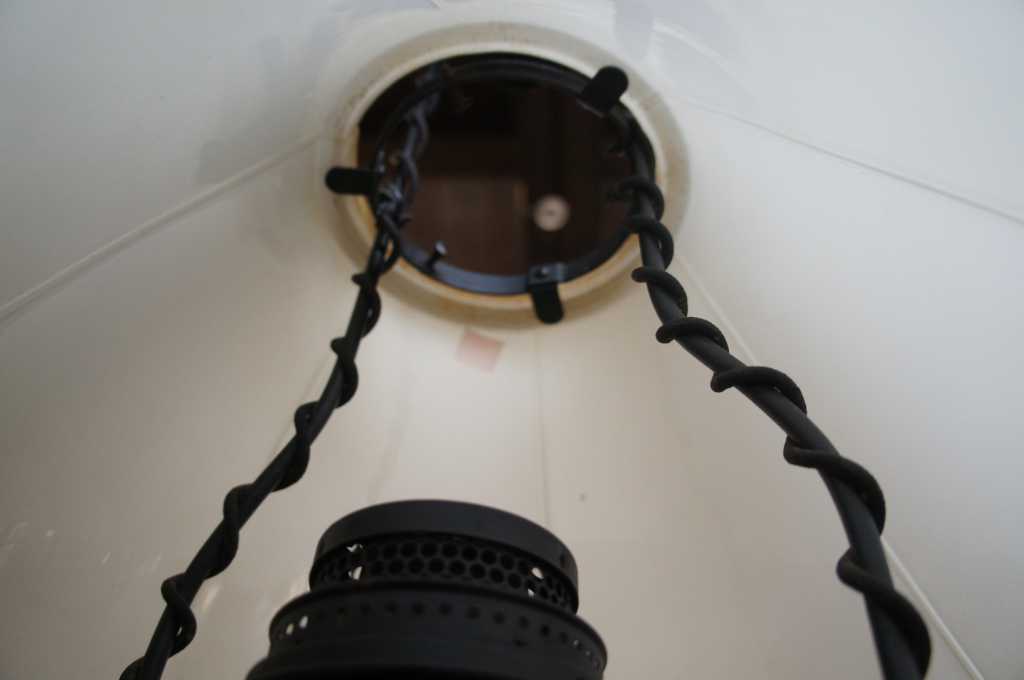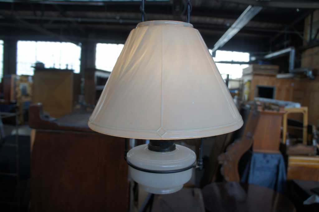 Early 20th century converted hanging lantern by Aladdin. Features a cast iron support which holds the large white glass shade and kerosene lantern. Marked along the switch, converted for electric.