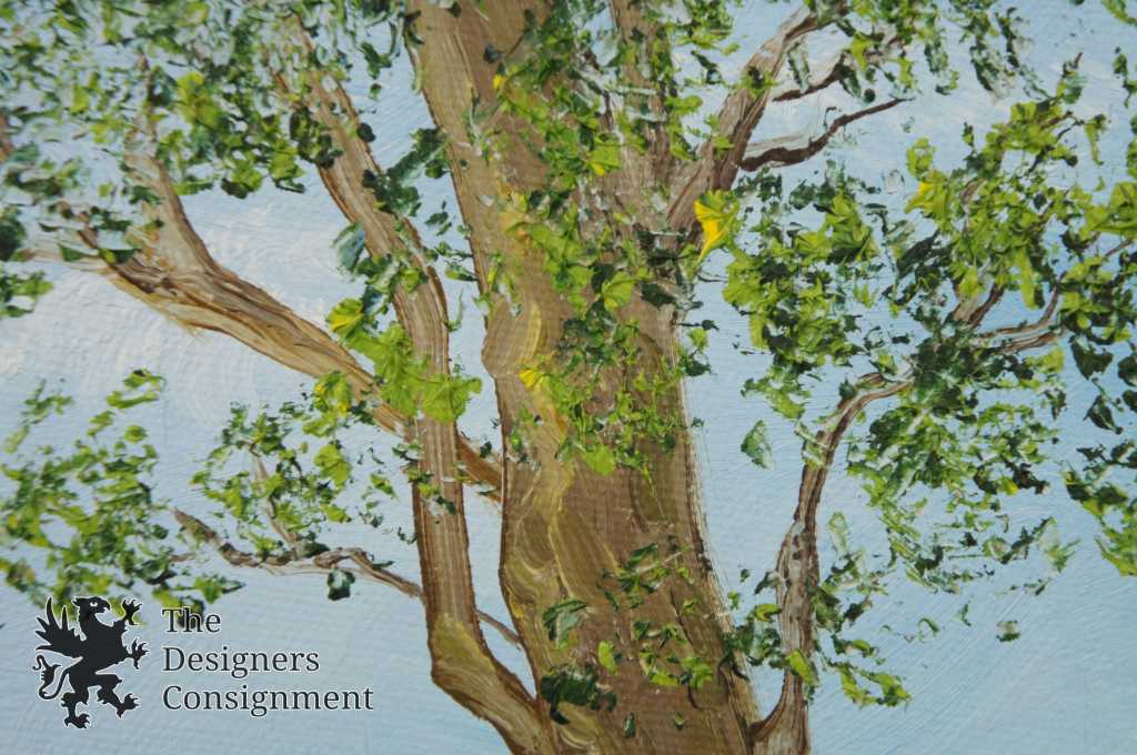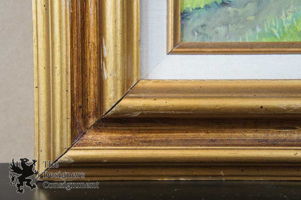 A vivid oil painting showing a farm landscape. Canvas Signed Newell lower right. Includes a wooden frame with gold trim.