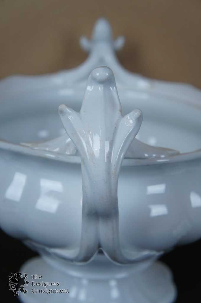 Features ornate ironstone lidded and handled soup tureen
