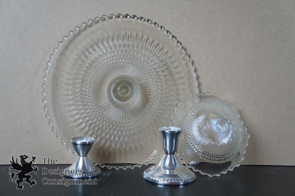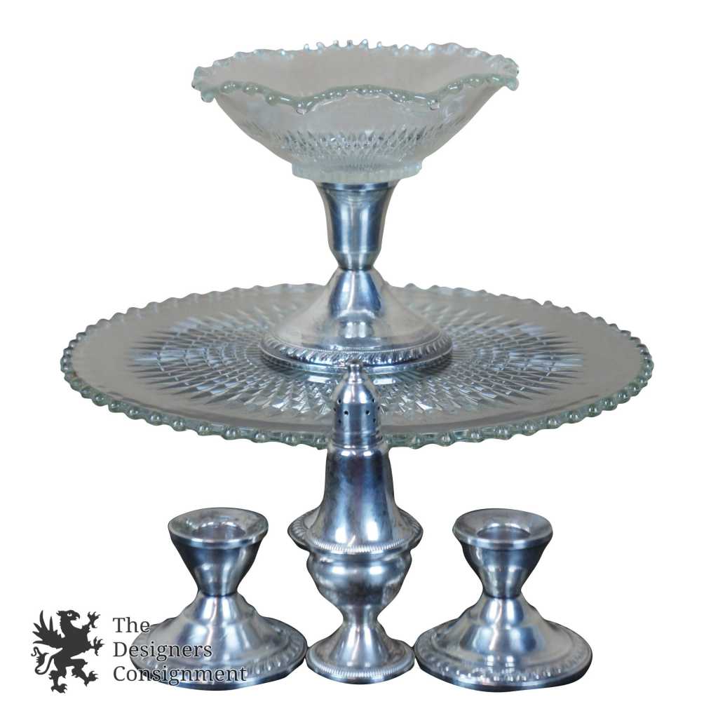 Features a footed cake plate, footed compote, a shaker, and candlesticks