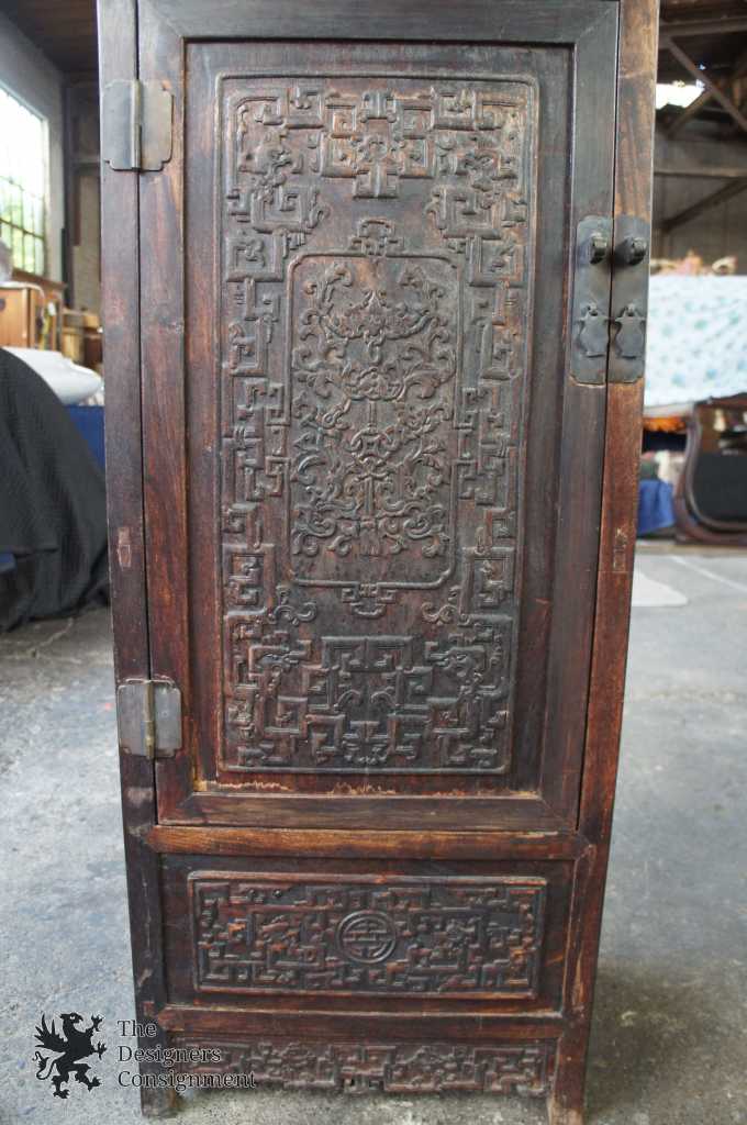 Early 20th century linen cabinet or cupboard. 2 pieces with meticulously carved hardwood and brass hardware. Opens to two shelves, a secret compartment below and upper cabinet above. The secret compartment is covered by a shelf with pierced center. The unit can be used as two pieces or one.