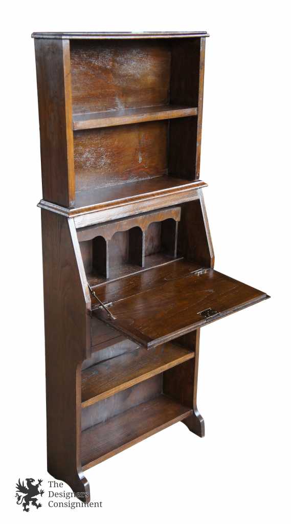 Circa 1940s Country Walnut Secretary Desk. Petite and slim line with drop front and lower drawer. Features 4 shelves for books or accessories. Interior has 3 cubbies for letters and files.