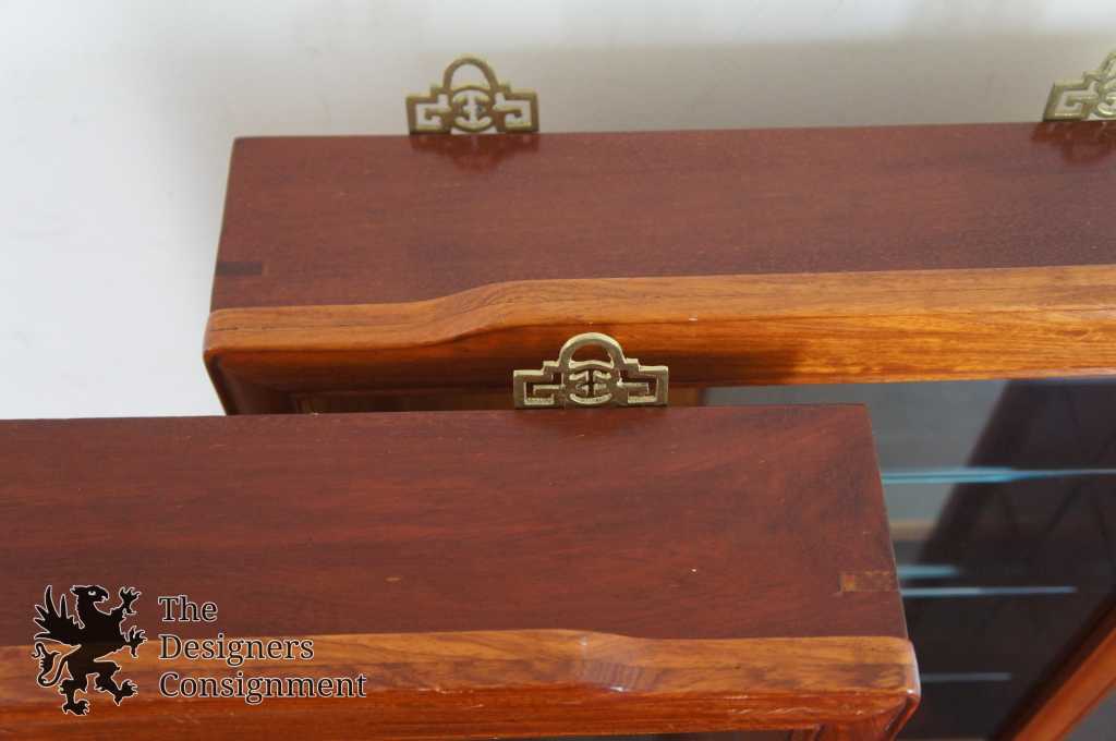 Made from Mahogany with a glass door, mirrored back and 3 glass shelves. Brass plates are mounted to the back for hanging along the wall