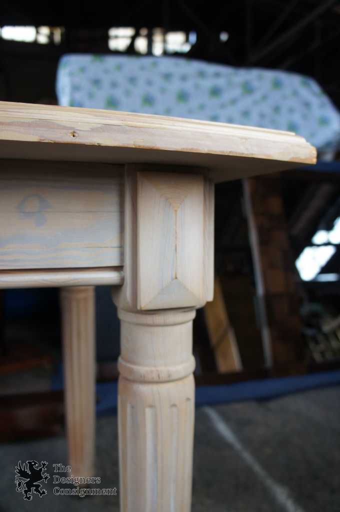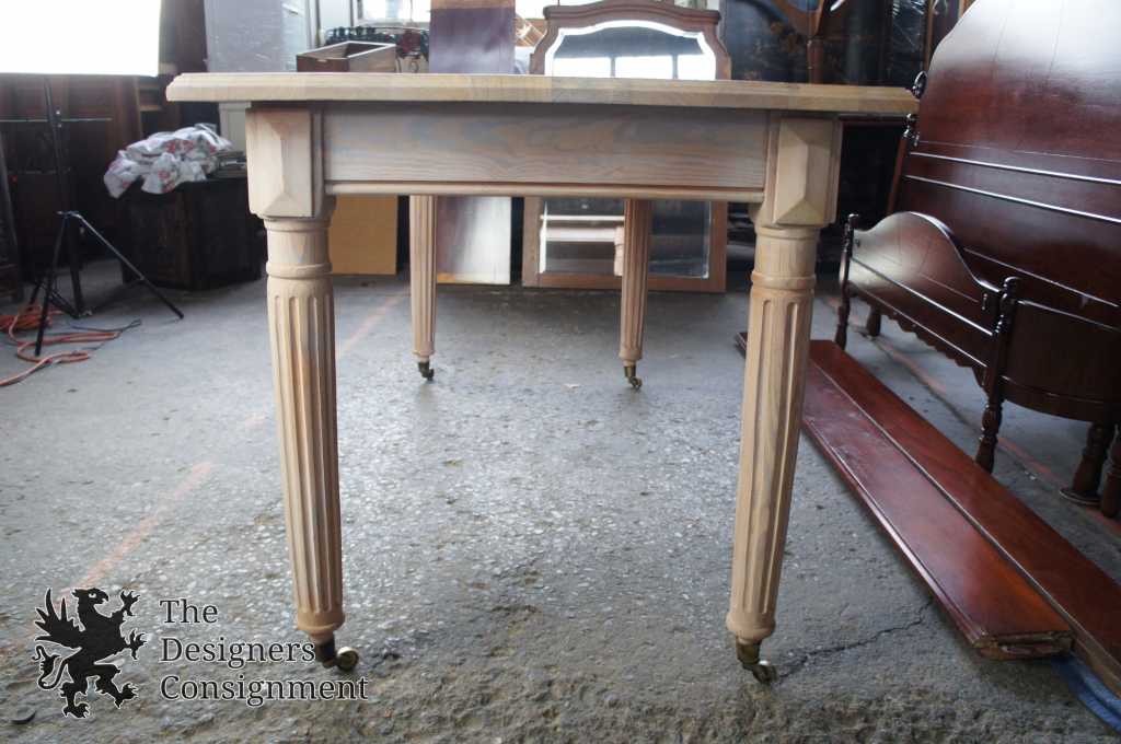 Neoclassical style desk in white washed pine. Fluted legs with brass casters