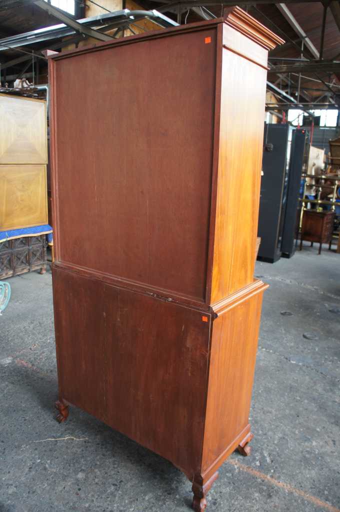 Antique European China Hutch, circa first half 20th century. Made from mahogany with mirrored backing marquetry and porcelain knobs. Lower cabinet rests on ball and claw feet. Upper molding is inlaid with satinwood. A great service piece for any setting.