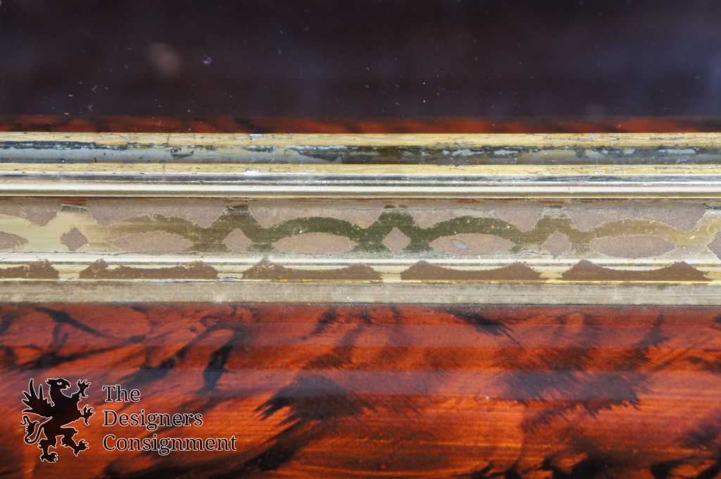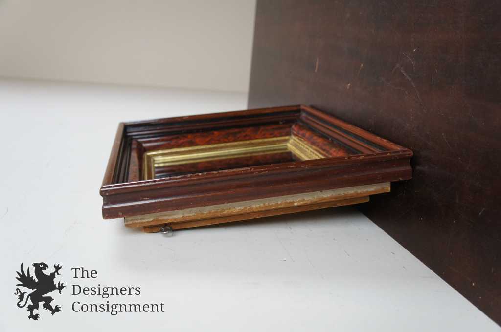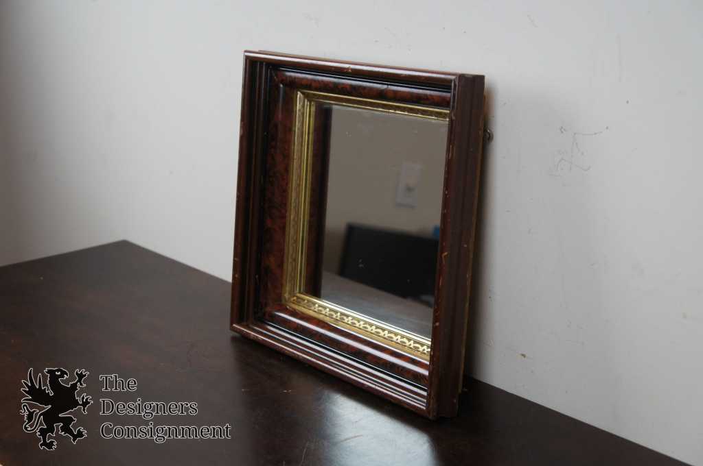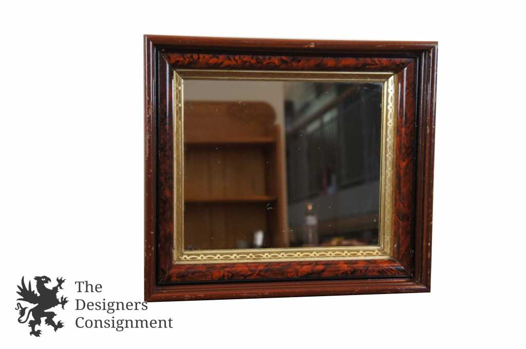 Early 20th century wall hanging mirror. Made from wood with a 3 tiered frame. The innermost is trimmed in gold with a fretwork pattern. Mounted outside of that is a painted wood grain that is mounted to outermost frame of walnut. A neat piece that will make a great addition to any setting.