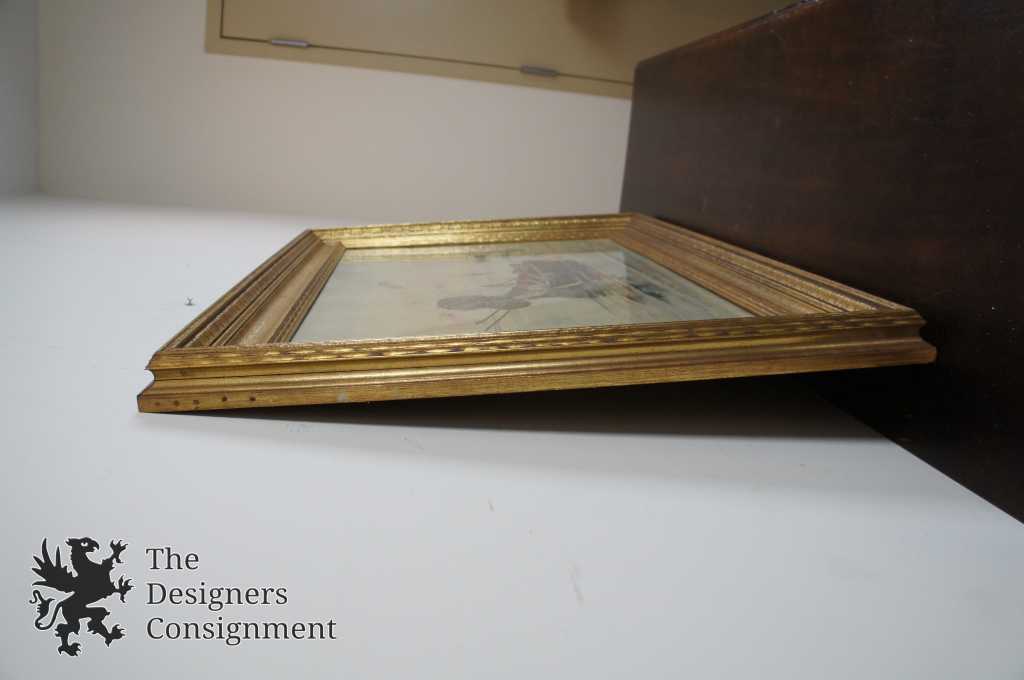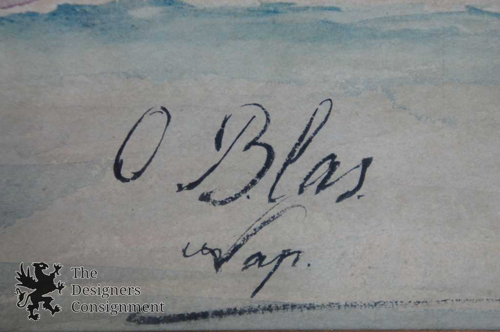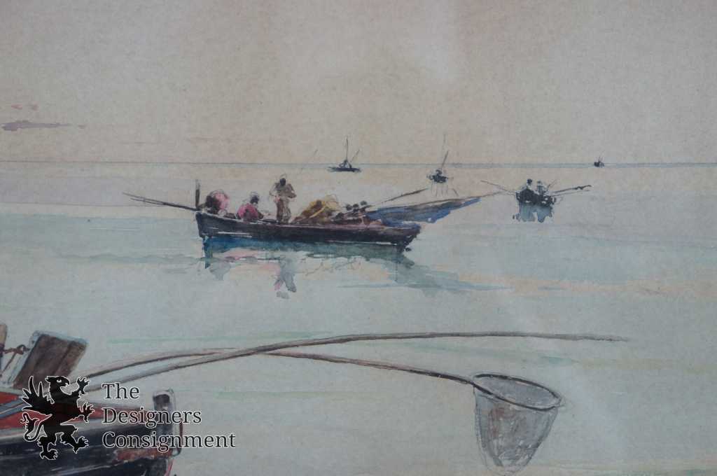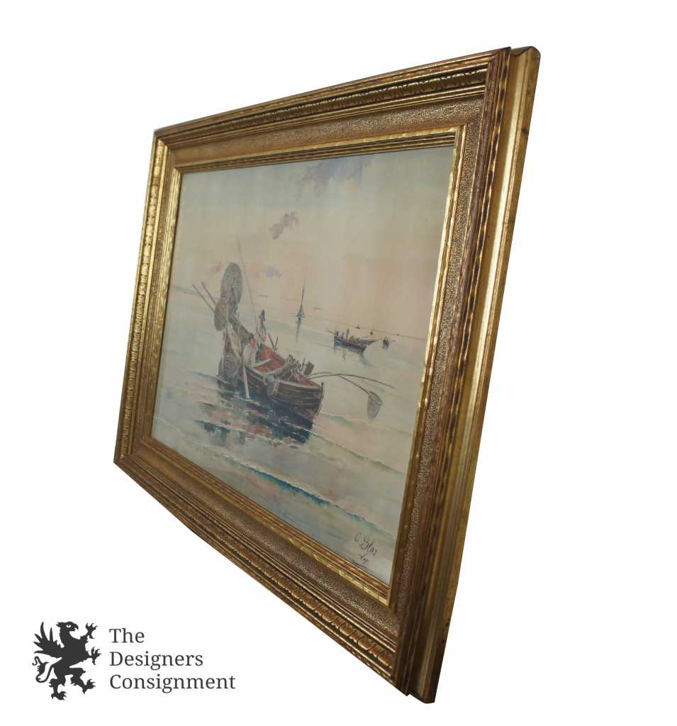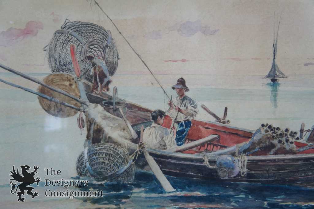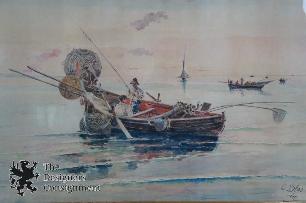 An exquisite watercolor by Olleroy Blas, signed lower right. Depicts a fishing boat out in the ocean. 2 men can be seen on board with reels, nets and other tools. Vivid color and detail. Features a victorian frame with gold finish.