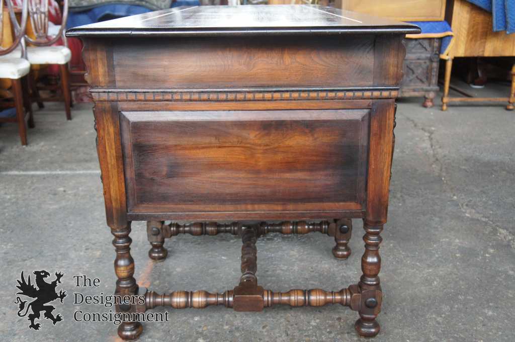 This stunning circa 1910s partner desk looks beautiful from all angles. It has high-relief carving on all drawers and cabinet doors. Inspired by Renaissance, Jacobean and Tudor styling. Two tone walnut decorations cover the desks entire surface. These heavy Gothic carvings give the desk a European flare. Perfect for use in any library, office or study.