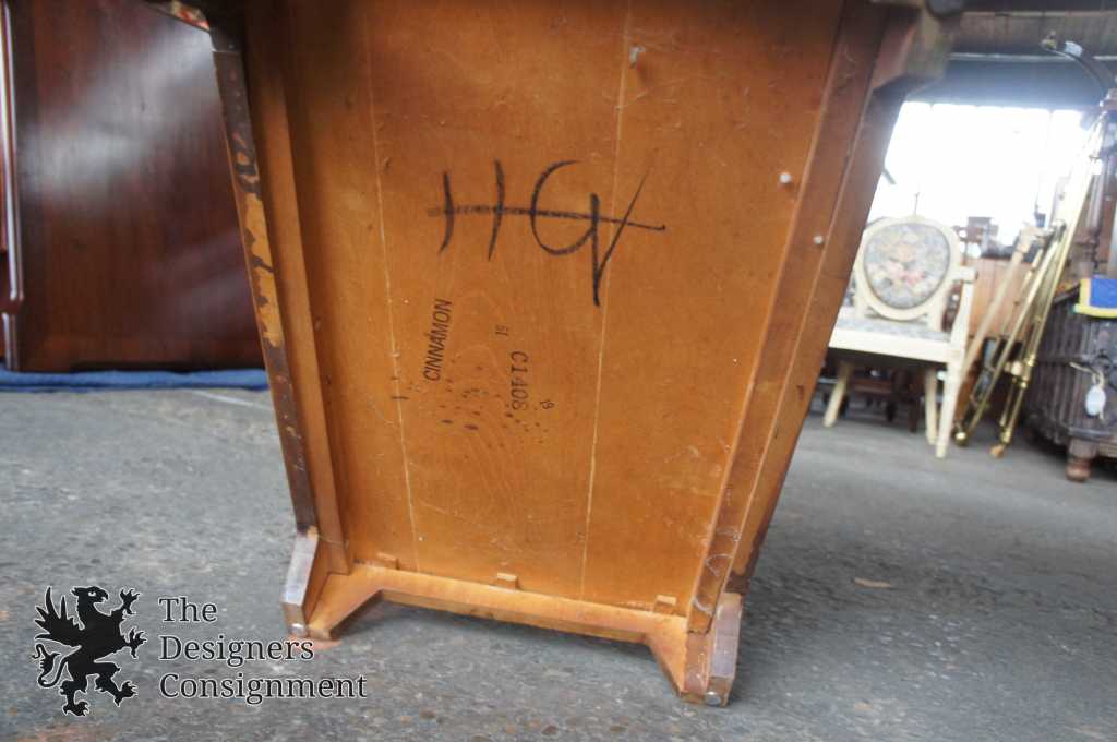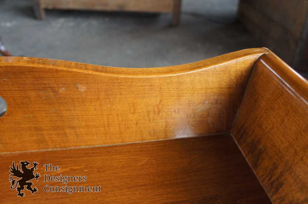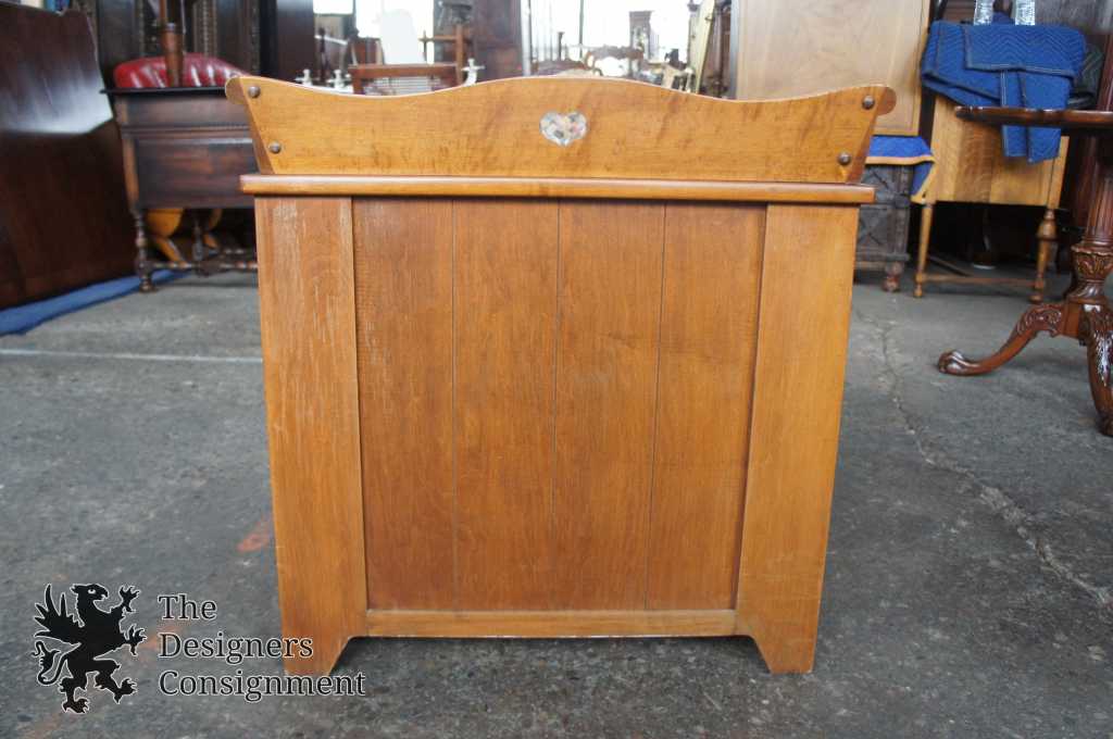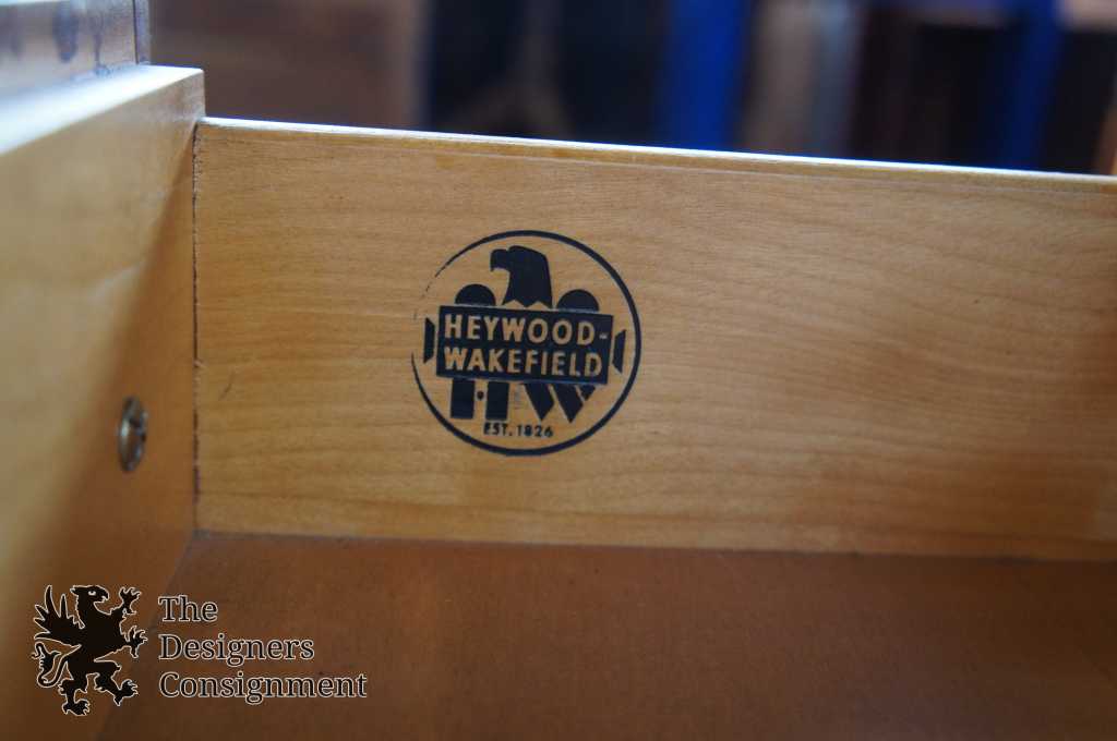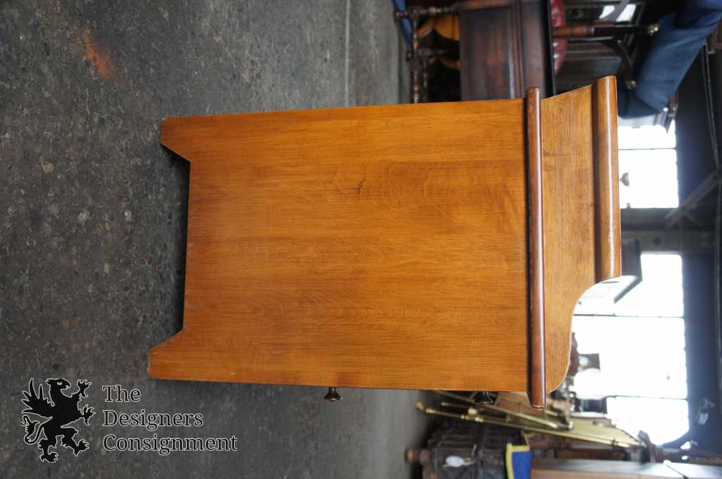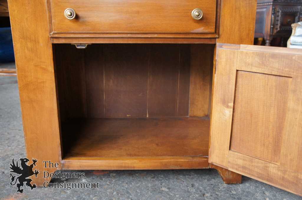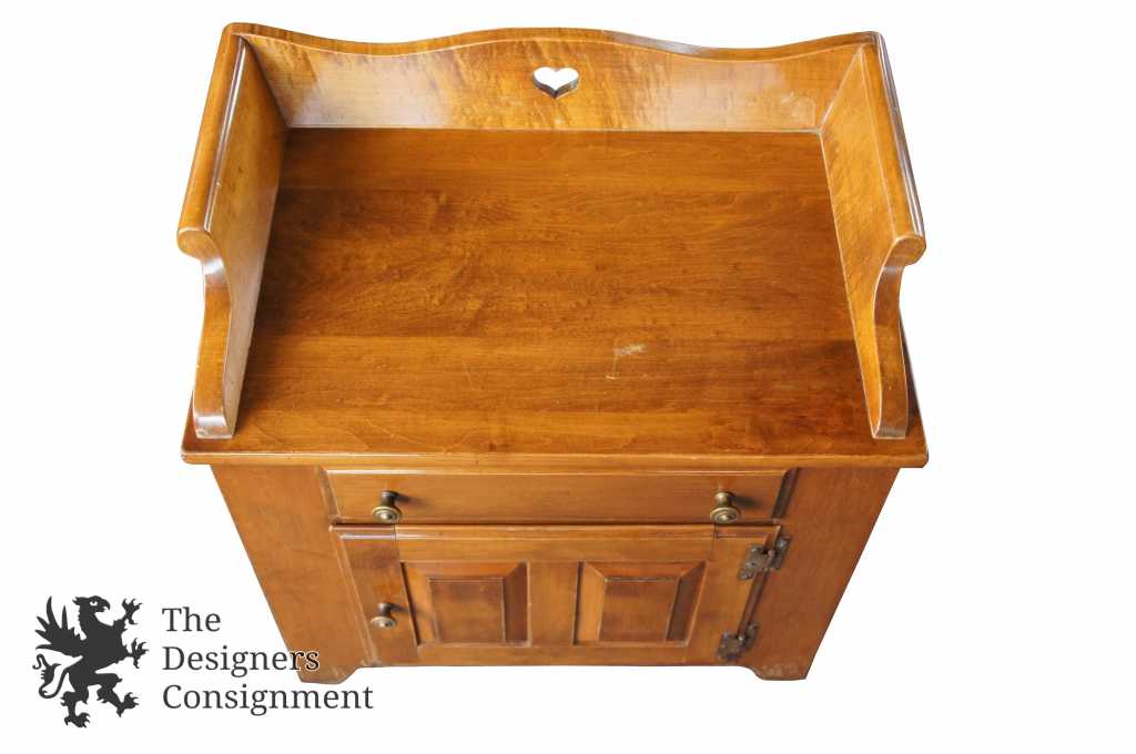 Solid Maple Washstand by Heywood Wakefield. Features an oxbow flared backsplash with heart at the center above lower cabinet and drawer. Wakefield mark can be seen along the left interior side of drawer. Marked Cinnamon C1408 along bottom
