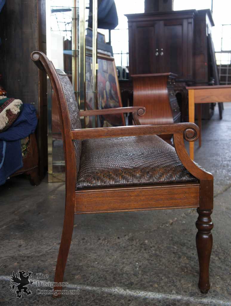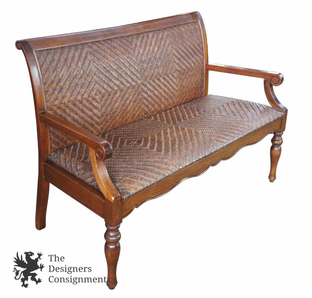 Traditional bench by Harden Furniture. Made from mahogany with a woven rattan seat. A very durable piece that works well in any setting. Naturally distressed with scrolled arms and a serpentine front apron. Marked harden along a stretcher beneath the seat.