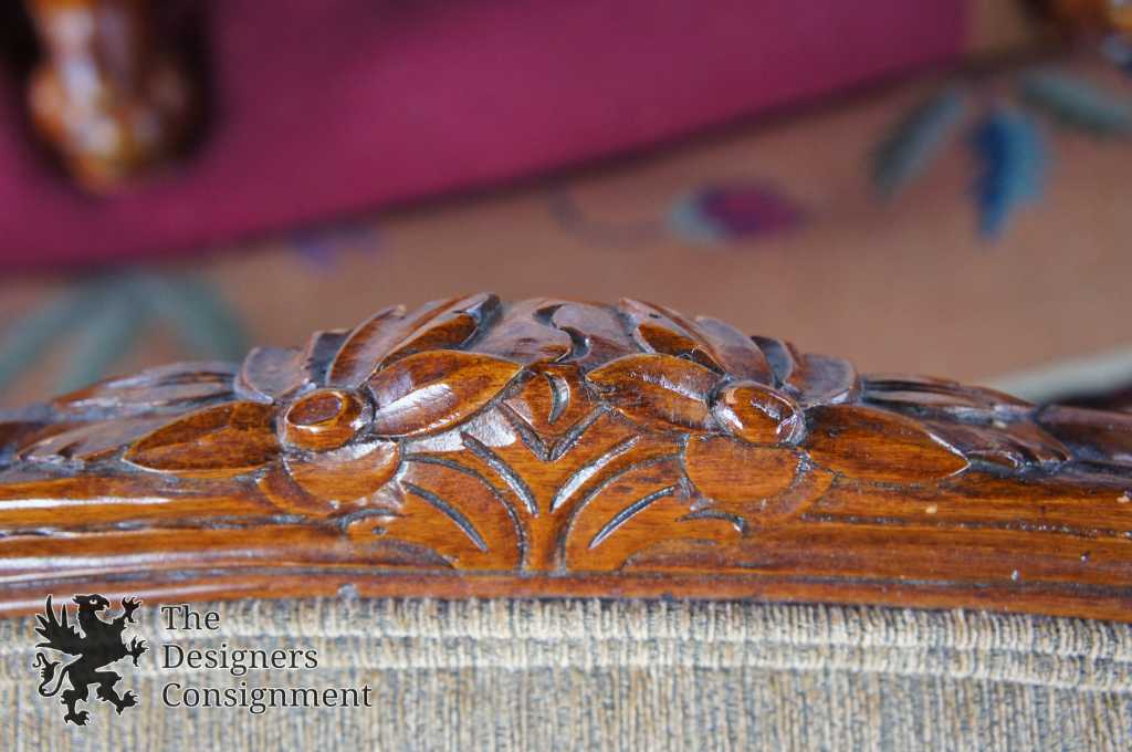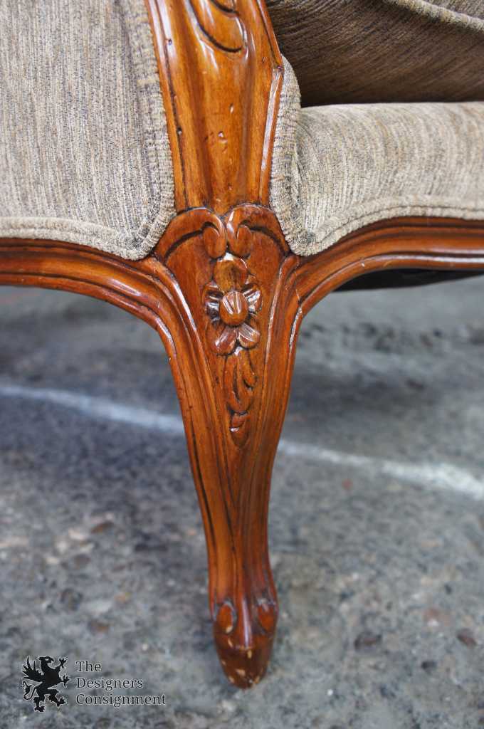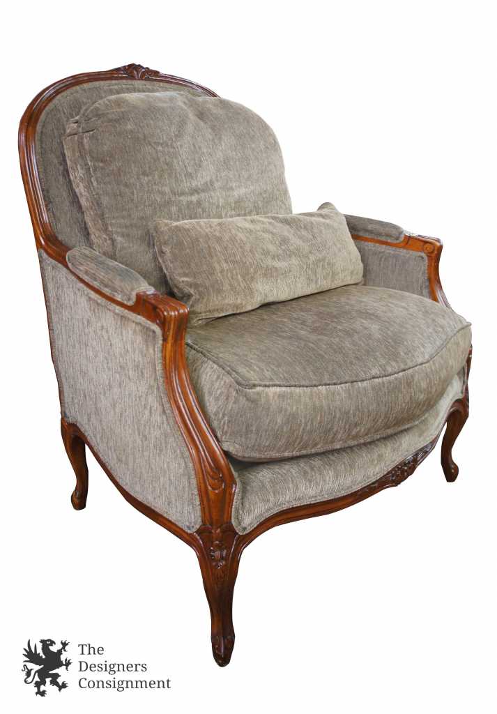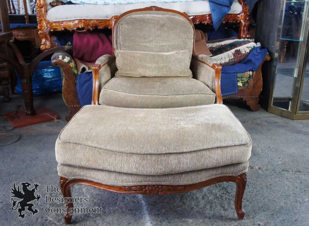 Louis XV Bergere Style Chair and ottoman by Henredon. Part of their upholstery collection. Neatly designed with a distressed frame featuring floral carvings. Upholstered in a grayish beige fabric.