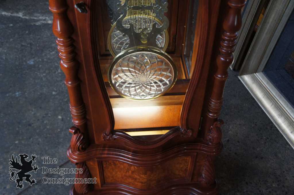 Dial is framed by carved and reeded posts and pendulum door is framed by curved capitals and turned posts