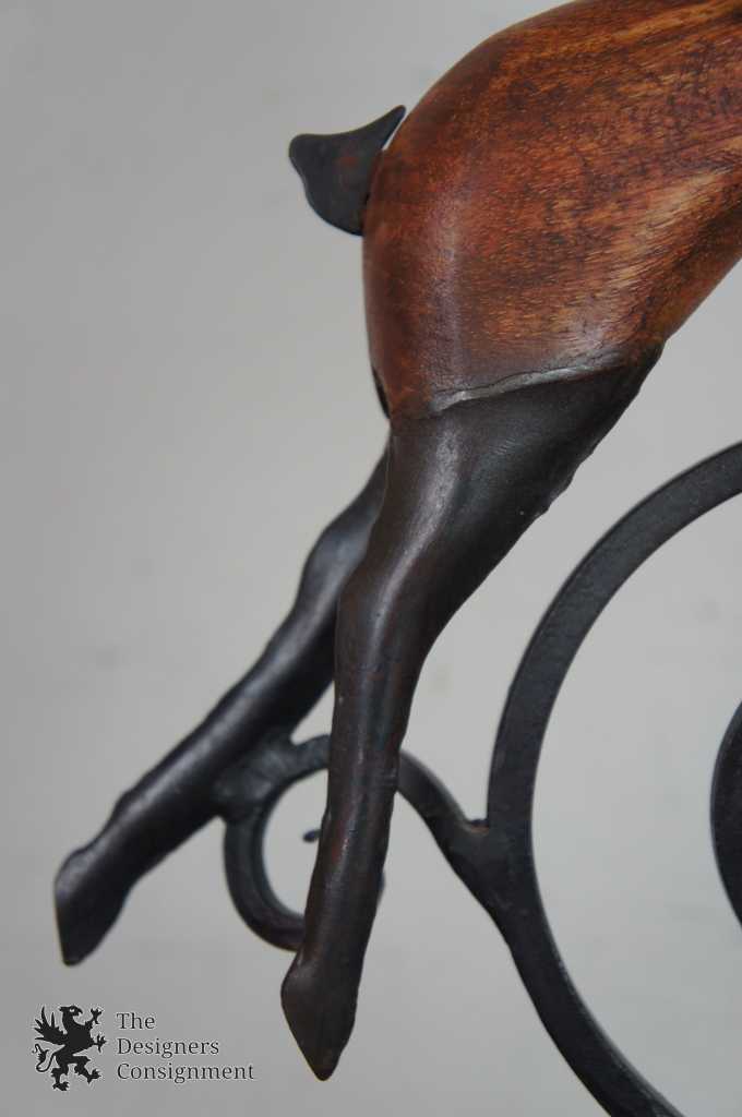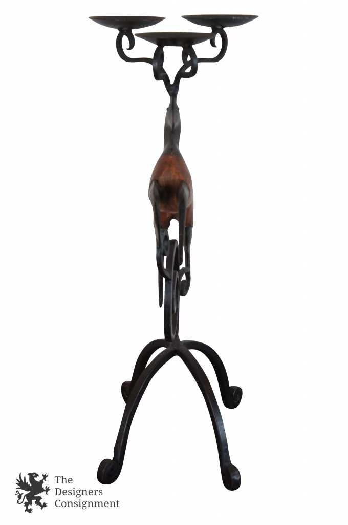 This stag candle holder is the perfect accent to any space. Made from wrought iron with a scrolled base, wooden center and metal body. The tiered stands neatly rest upon the deer's antlers.