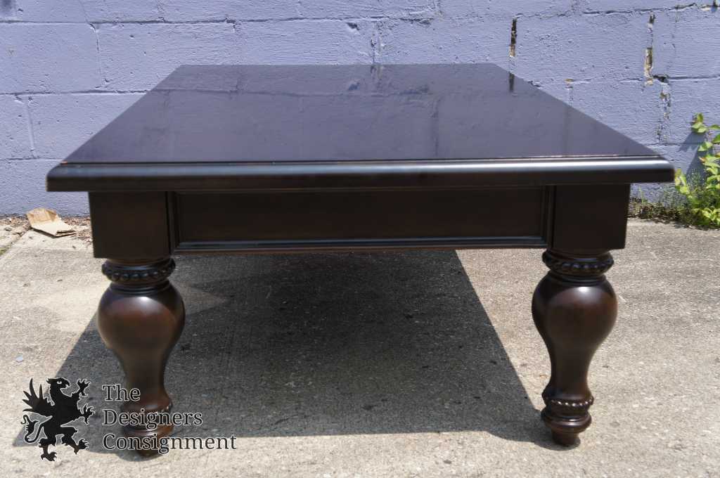 This rectangular cocktail table is made from mahogany with a dark espresso finish. The beautiful turned legs add graceful curves and soften the piece's silhouette.