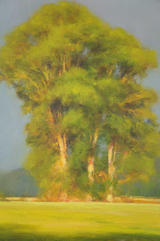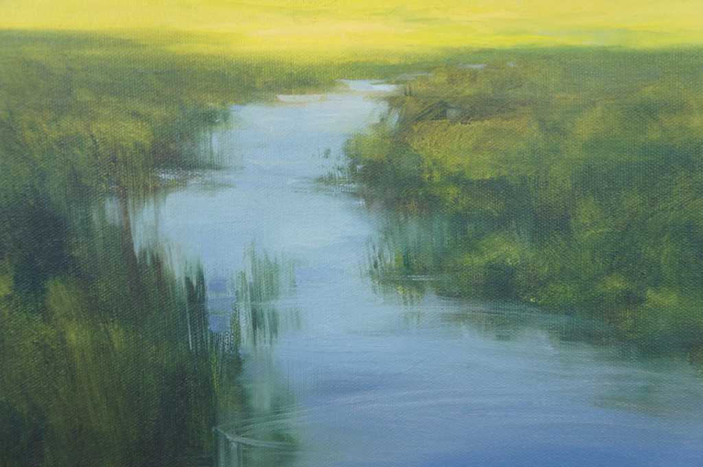 This lovely oil painting shows a valley view Plain view. luscious greens and blues on a clear day creek-side. A canvas painting, signed lower left. Framed in a marbled green design with gadrooning along the edge.