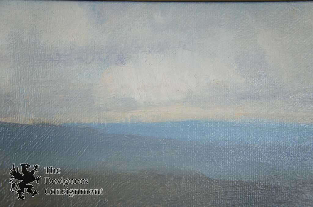 This lovely oil painting shows a valley view creek-side. luscious greens and blues on a cloudy day. The rocky mountains can be seen in the background. A canvas painting, signed lower right. Framed in an elegant gold design.