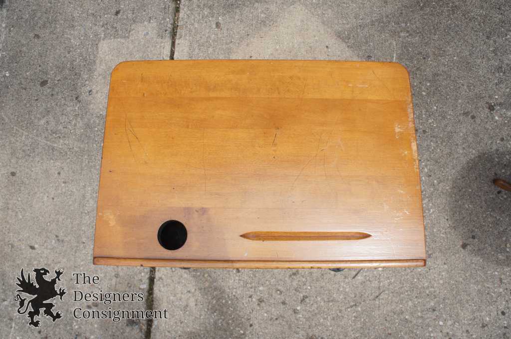 Early 20th century cast iron and maple school desk. Features a lower cubby, inkbottle and groove for steel-point