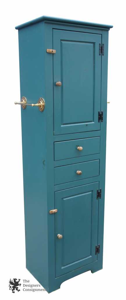 This beautiful linen cabinet is from their Mastercraft line which was all pine furniture. Manufactured in the latter half of the 20th century. The cabinet is a green color with naturallatches and pulls. There are towels bars along the left and right side. Both central drawers are dovetailed and the makers mark is stamped along the back.
