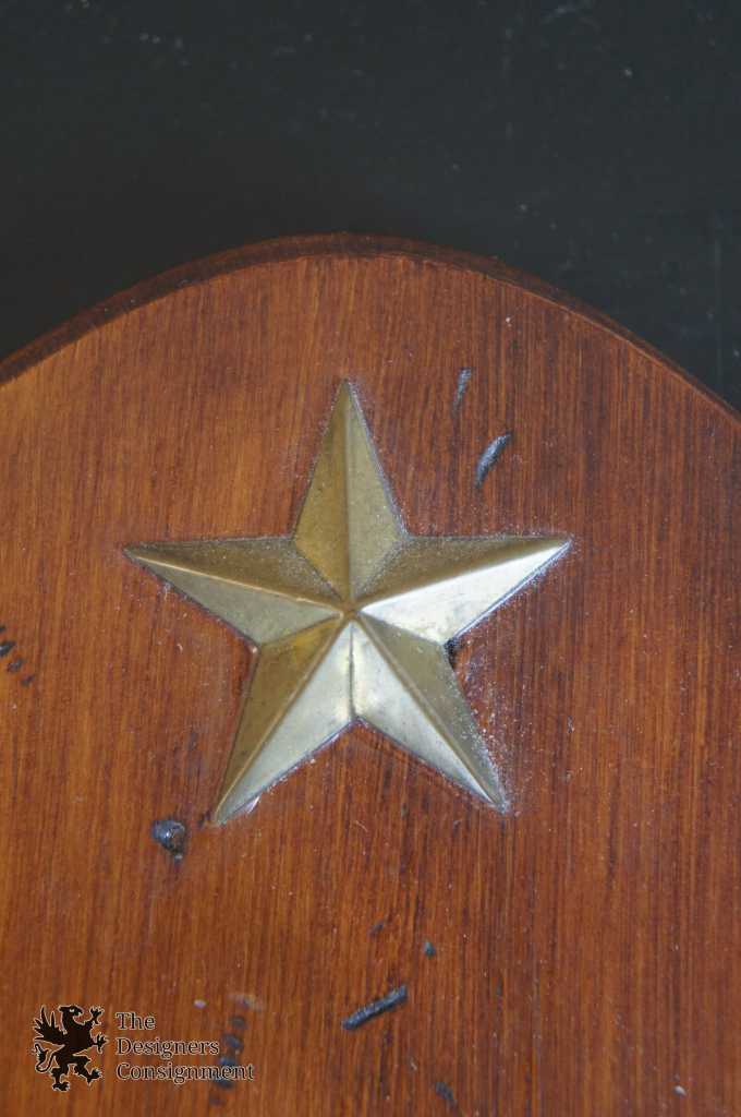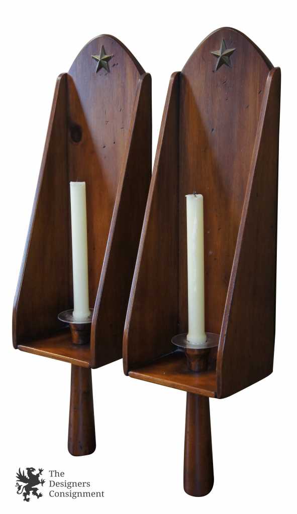 A stunning pair of early american style dust pan sconces. Circa mid 20th century. Solid pine with clean lines, wooden candle holder and star along the top. Hole placed along the back for hanging. A fun addition to any space.