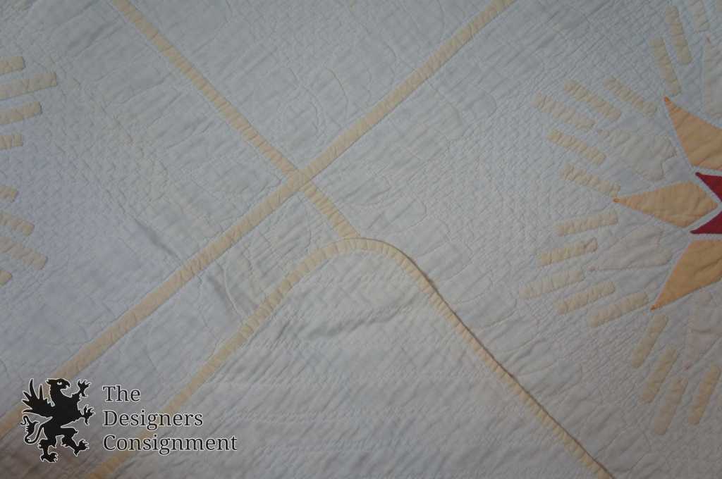 Features a white field with applique red star pattern with yellow sunbursts and accents