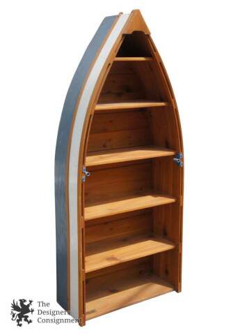 The boat bookshelf is made from cedar and has a painted Grayish Blue & White frame. Includes Matching Gray Oar Locks.