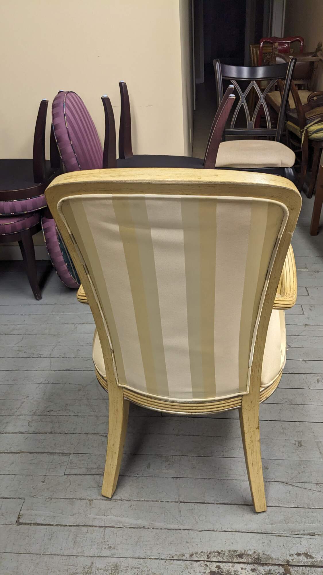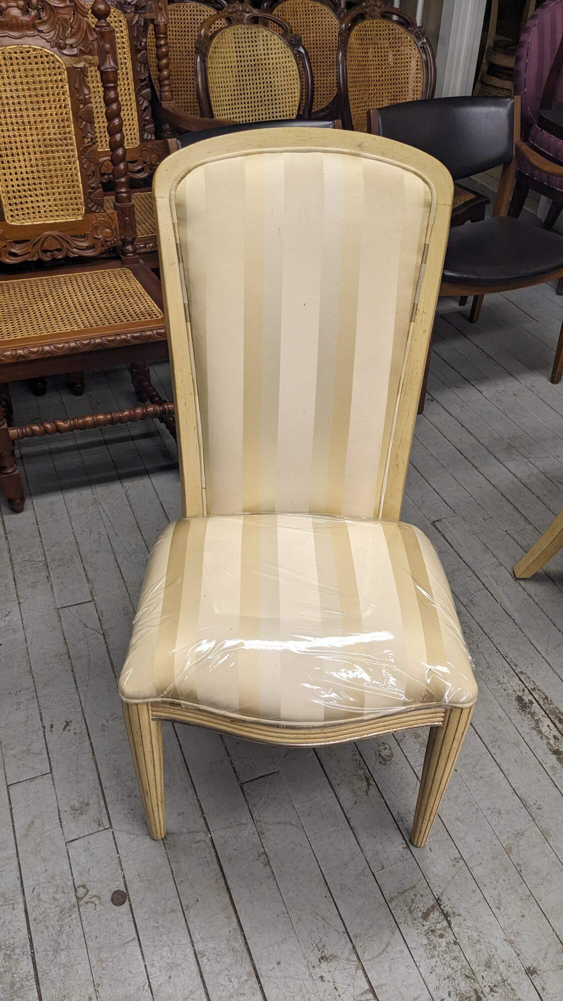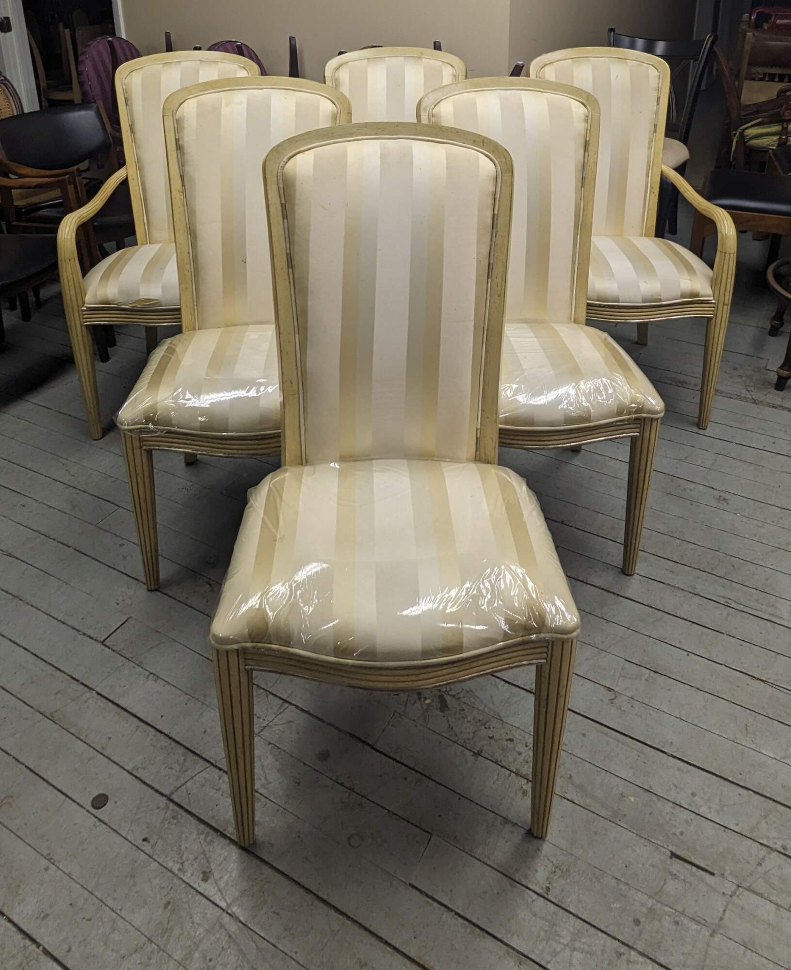 Set of six Century Furniture pickled oak dining chairs. Features a striped upholstery and ribbed frame.