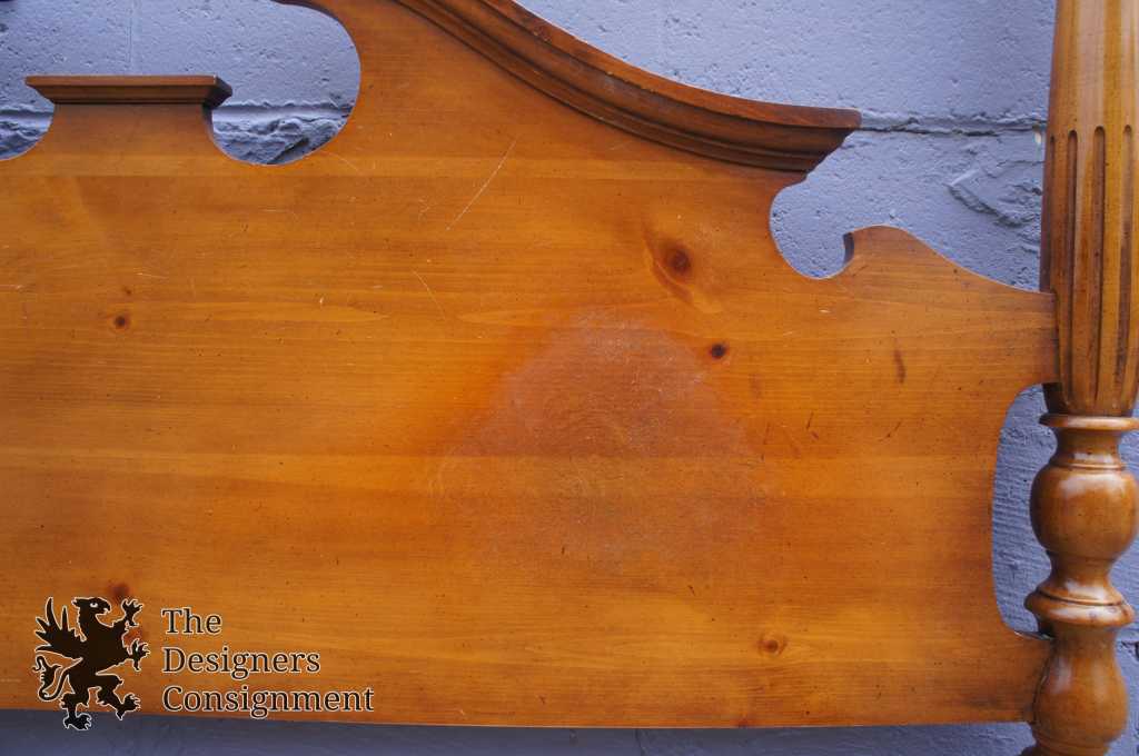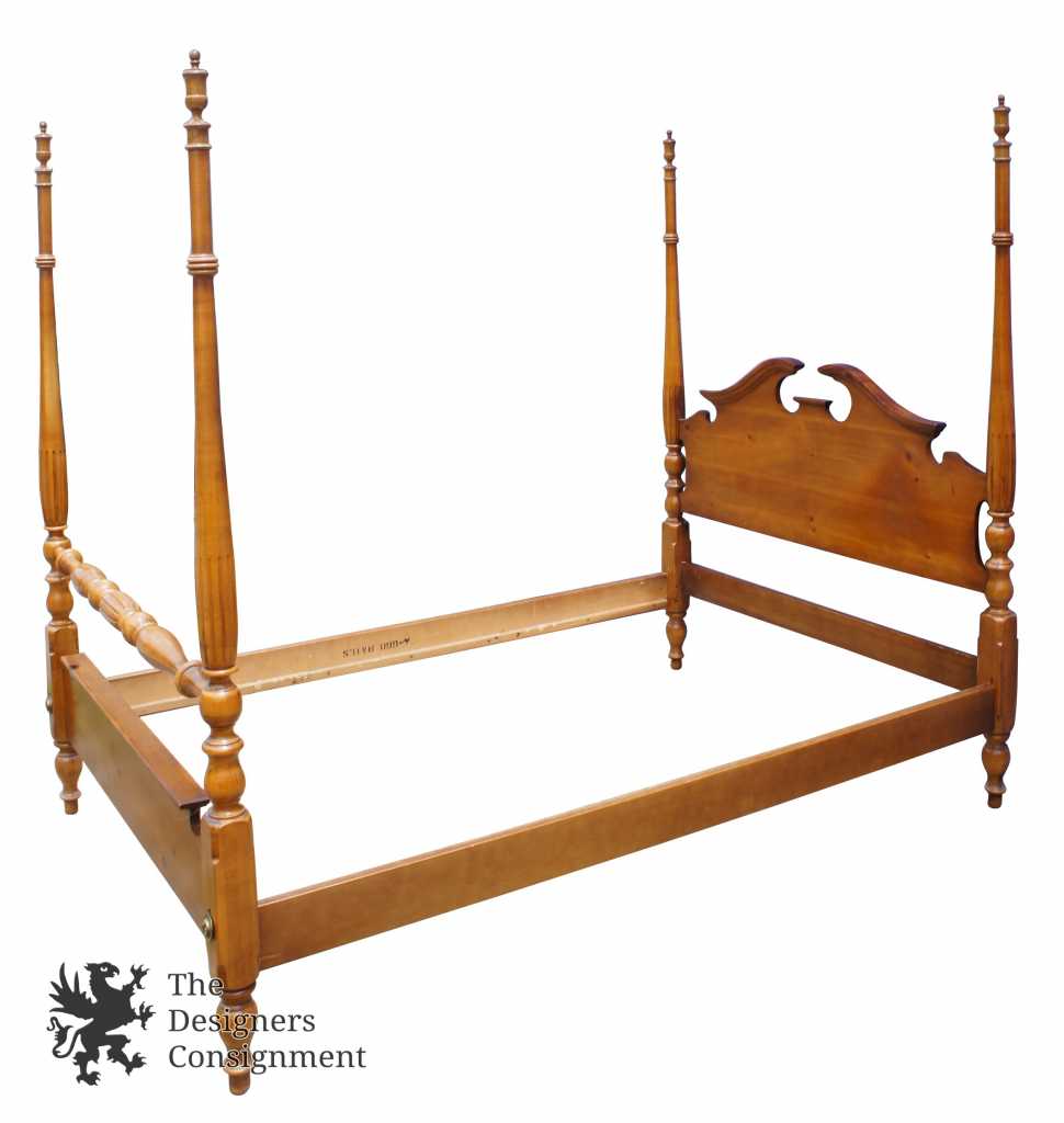 A beautiful four poster pine bed frame. An open pediment design with removable trophy finials and turned fluted posts. This bed comes from the original owner and was purchased from The Rike-Kumler Co in Dayton, Ohio. Rikes was one of the largest departments stores when it opened, remaining in business until they were bough out by Lazarus. Marked A-660-25 88 along the back.