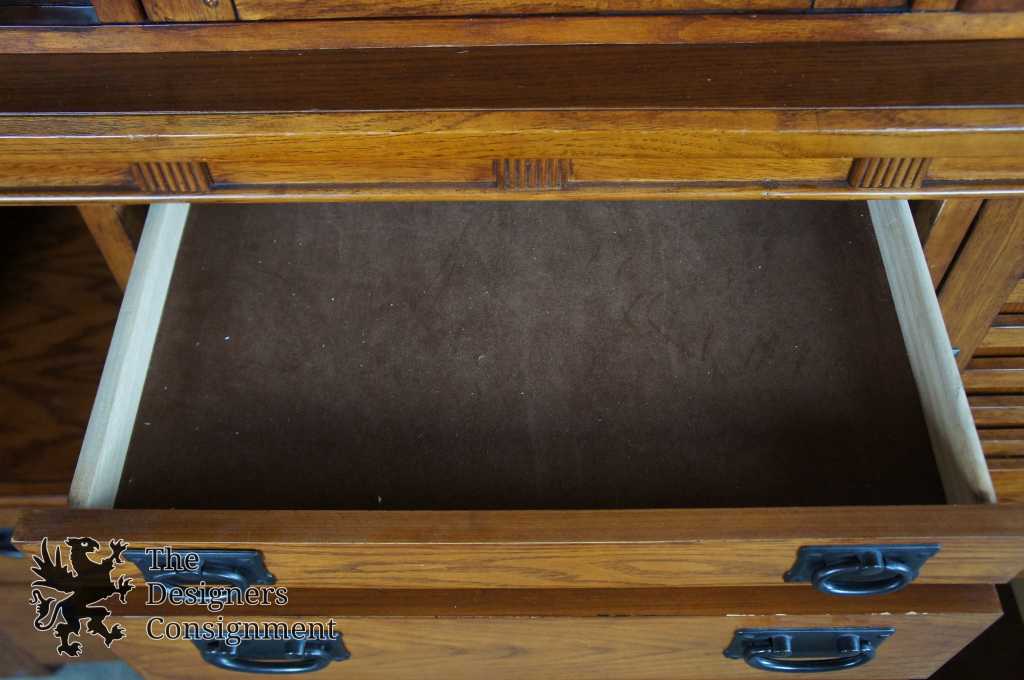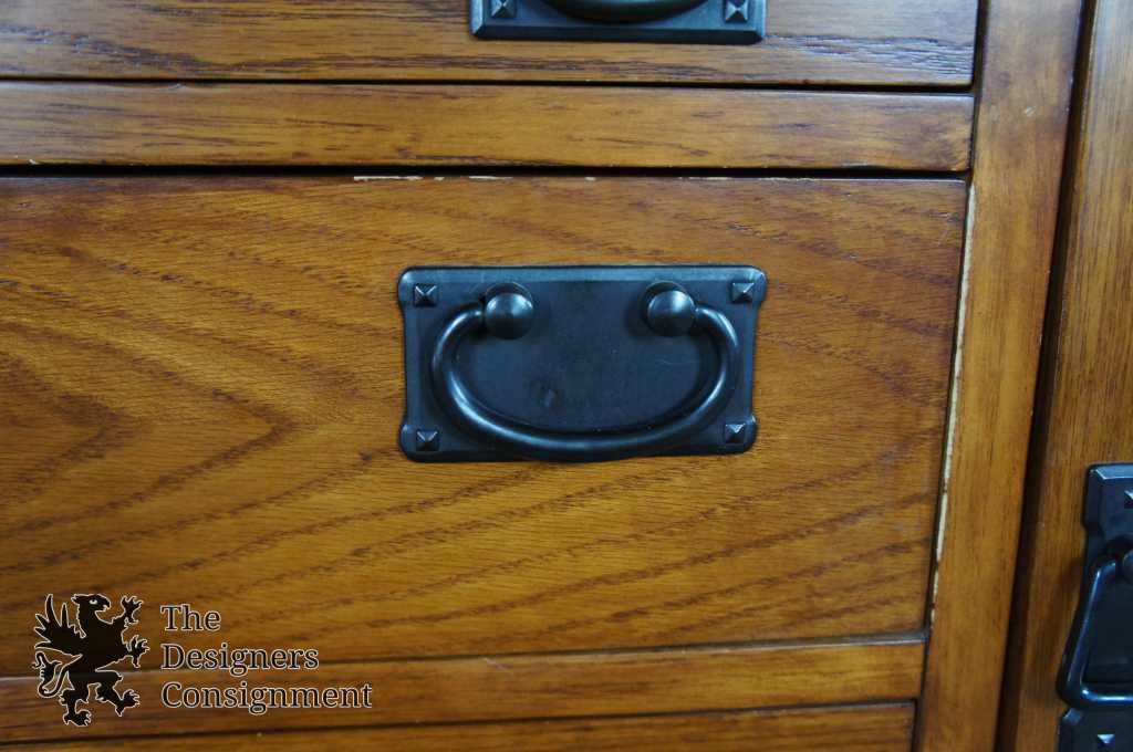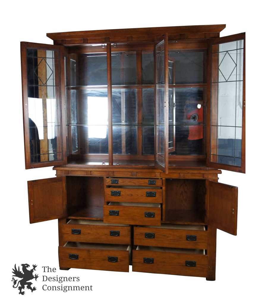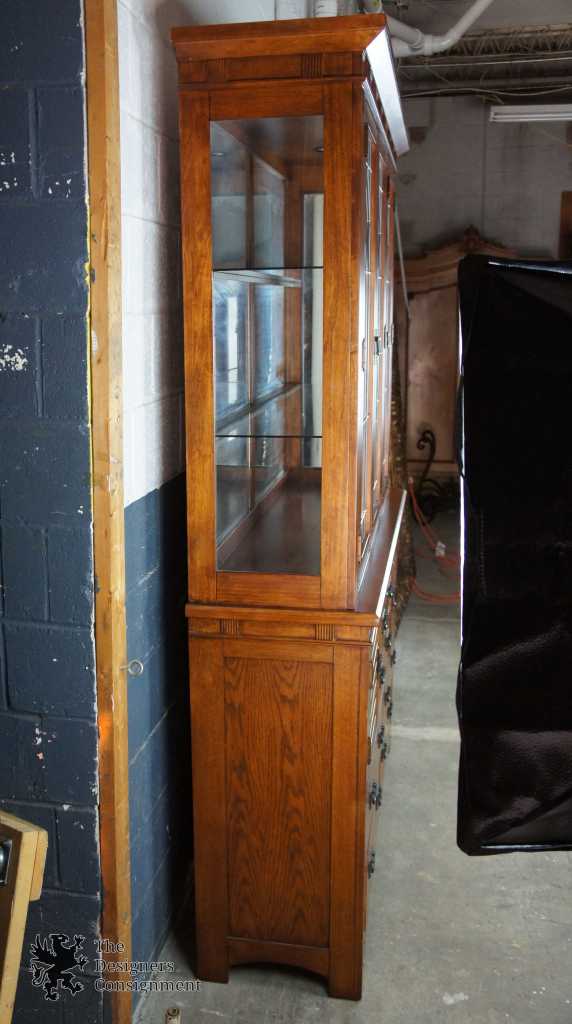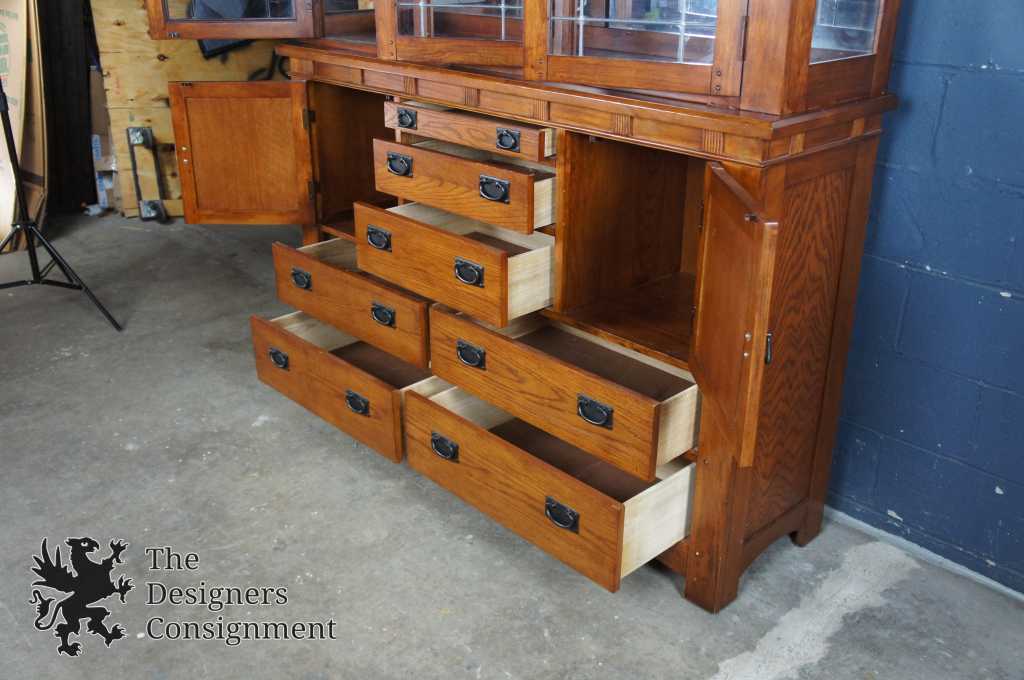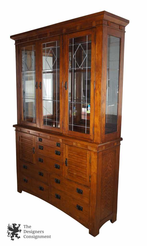 An impressive Mission inspired buffet & hutch. With seven drawers and two lower cabinet there's a plethora of space for storage. Hutch features a leaded glass front, glass shelves and mirrored backing. Finished in Spanish Oak. Purchased in 2007.